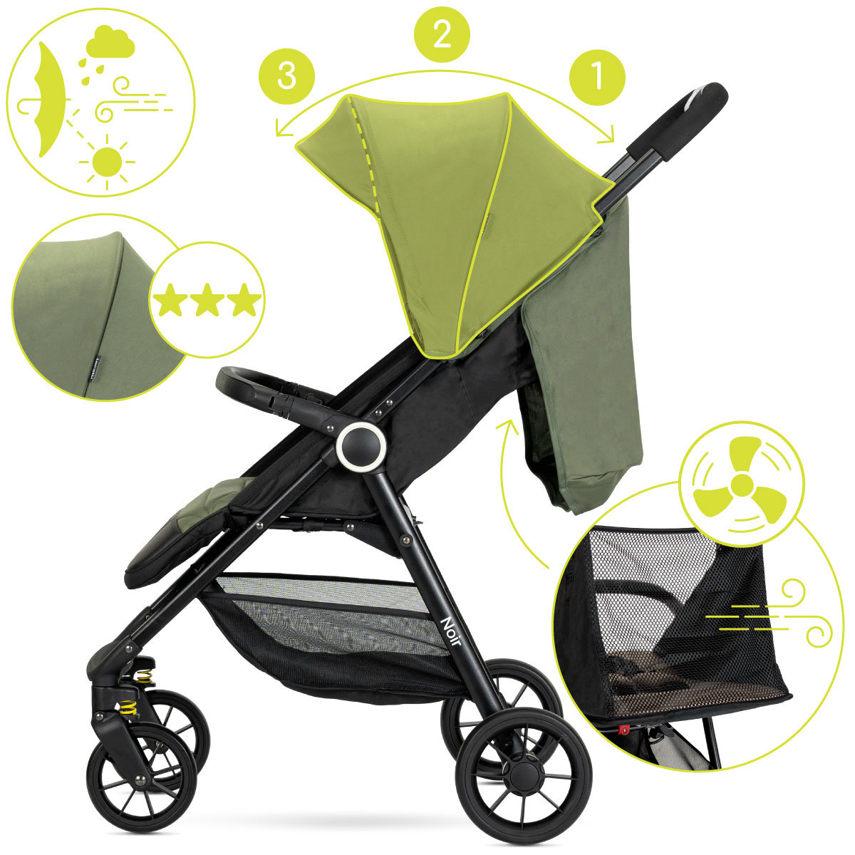 Lorelli Noir to kompaktowa spacerówka do 22 kg, która łączy składanie jedną ręką, zwrotne koła 360° i obszerną budkę. Przydatne funkcje upraszczają codzienne życie rodzica. Idealna do miasta: lekka, poręczna i gotowa na szybkie wypady oraz dłuższe spacery.Lorelli Noir – lekka, miejska spacerówka na każdy dzień