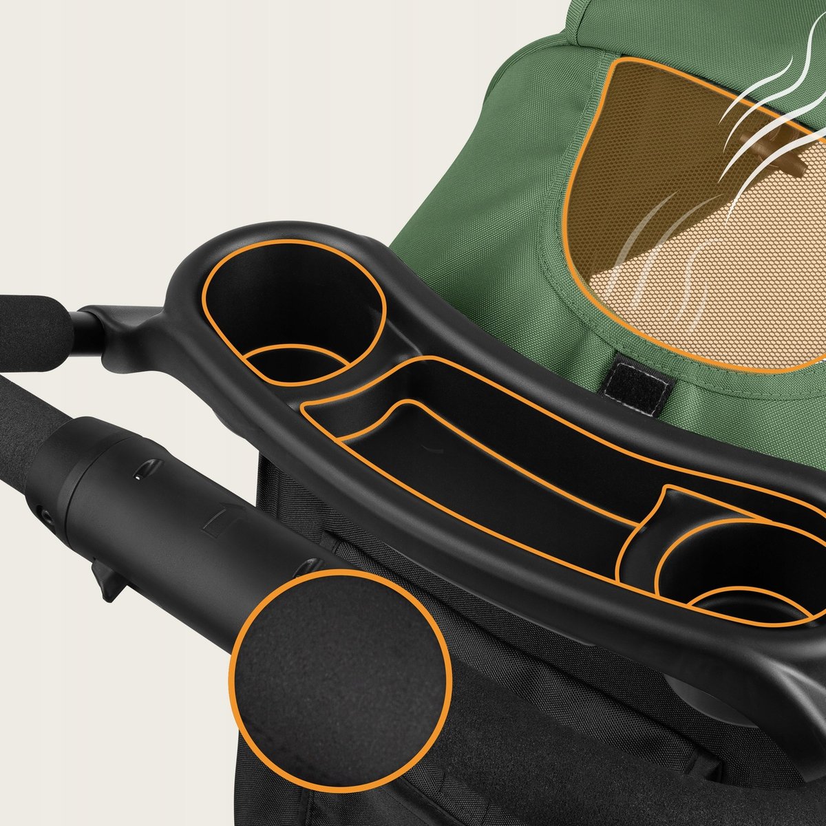 ✔️ Organizer dla opiekuna – umieszczona na rączce długa tacka wyposażona jest w 2 uchwyty na kubek oraz głęboki pojemnik.