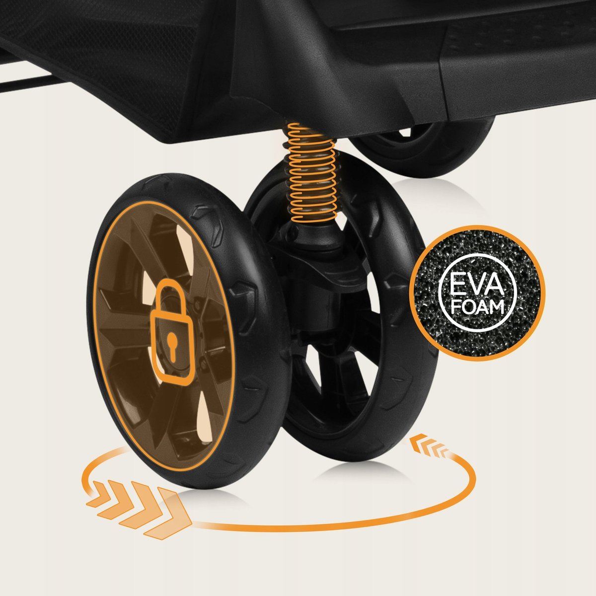 ✔️ Amortyzowane koła zapewniają maksymalny komfort i stabilizację jazdy, znacząco ograniczając wstrząsy podczas jazdy na nierównej powierzchni. Przednie koła o średnicy 18 cm, tylne 20 cm