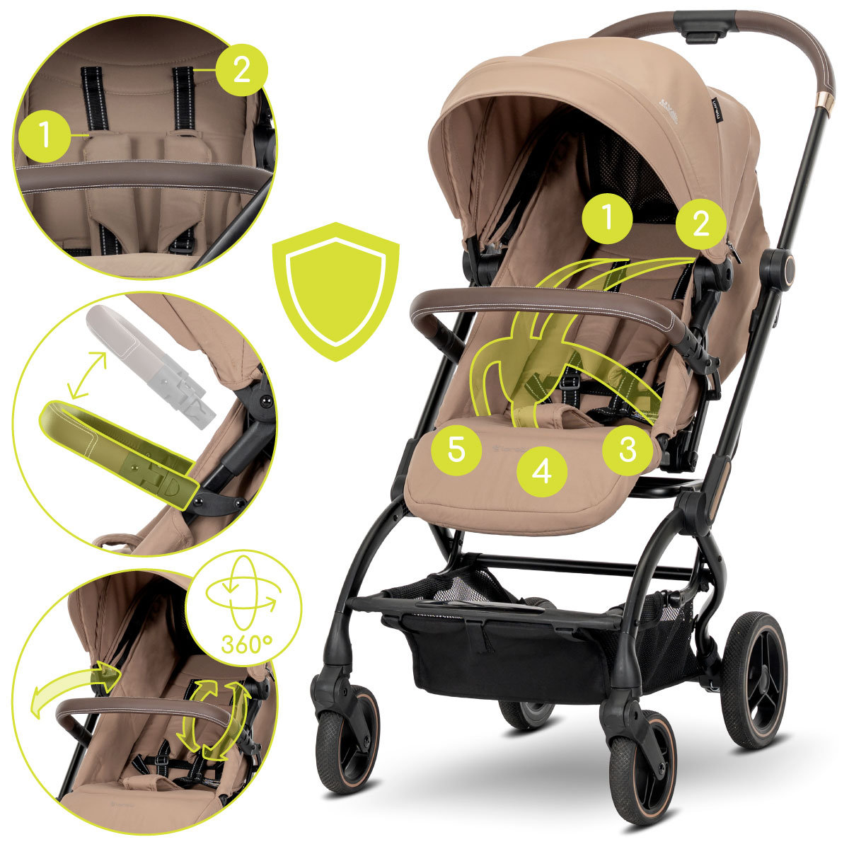 ❇️5-punktowy system pasów bezpieczeństwa z dwustopniową regulacją wysokości pozwala dopasować prowadzenie pasów do wzrostu. ❇️Maluch podróżujący wózkiem Makaya utrzymuje przez cały czas prawidłową pozycję barków i bioder. ❇️ Pałąk z eko-skóry jest wygodny w chwycie i łatwy w czyszczeniu. Pałąk jest łatwo odpinany i ułatwia wsiadanie i wysiadanie.Pasy 5-punktowe z regulacją wysokości