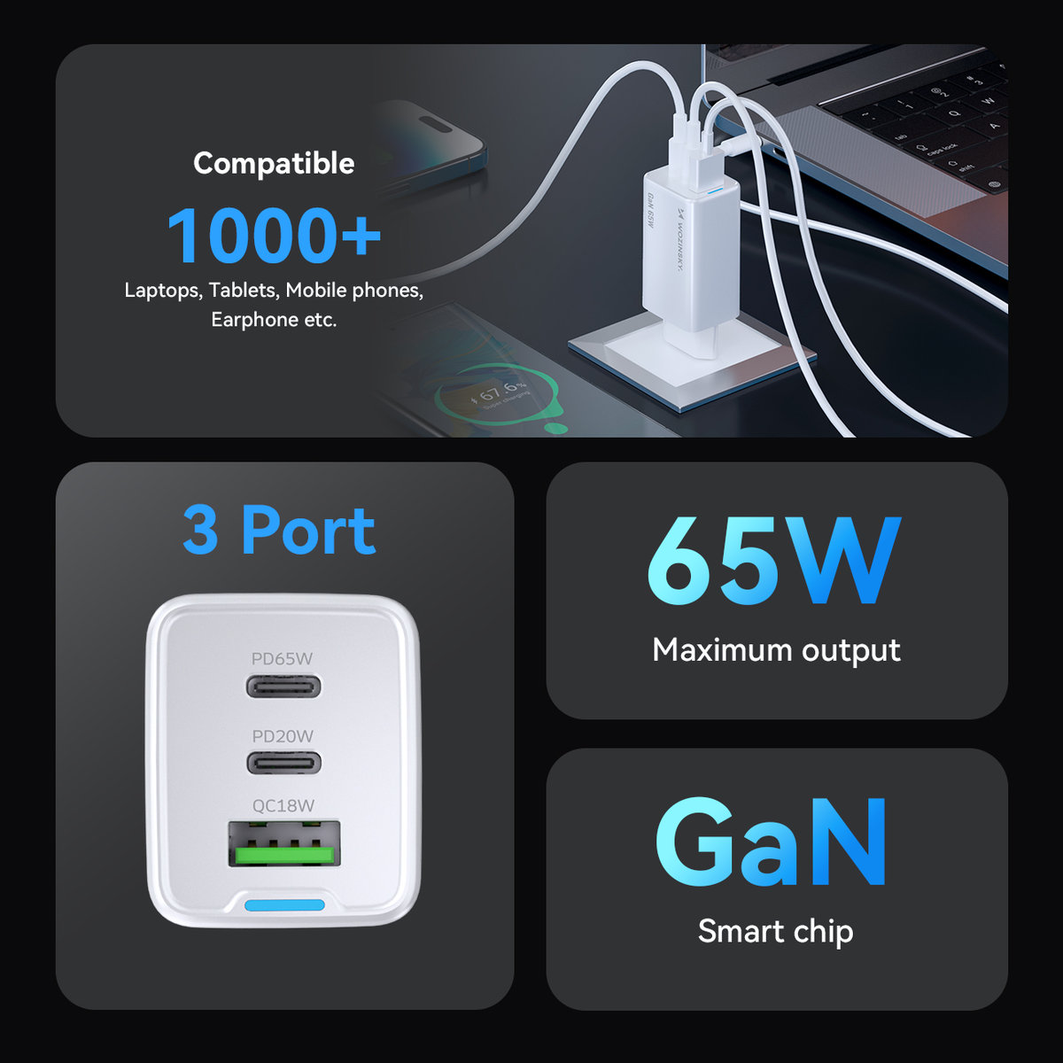 ➢ Moc 65 W: Ładowanie wysokiej szybkości dla laptopów, tabletów i smartfonów.