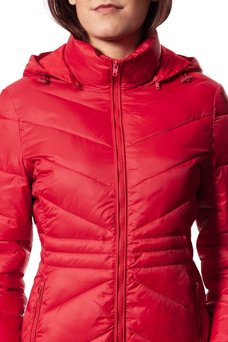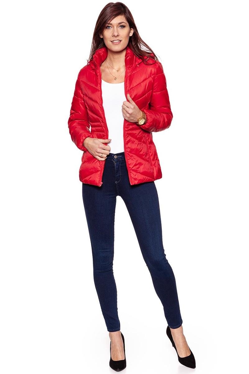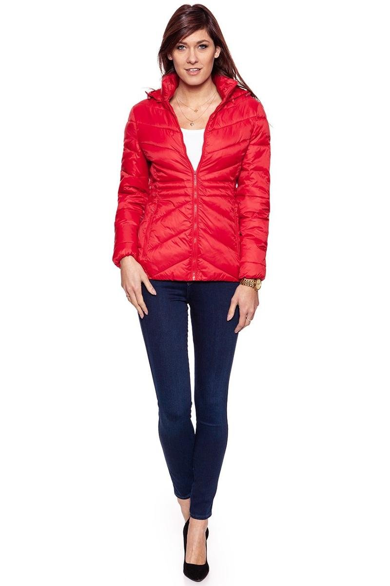 damska kurtka typu puffer w czerwonym kolorzedopasowany fason podkreślający figuręściągacze w rękawach oraz na doleodpinany kapturdwie praktyczne kieszonki zapinane na zamekmateriały wysokiej jakości