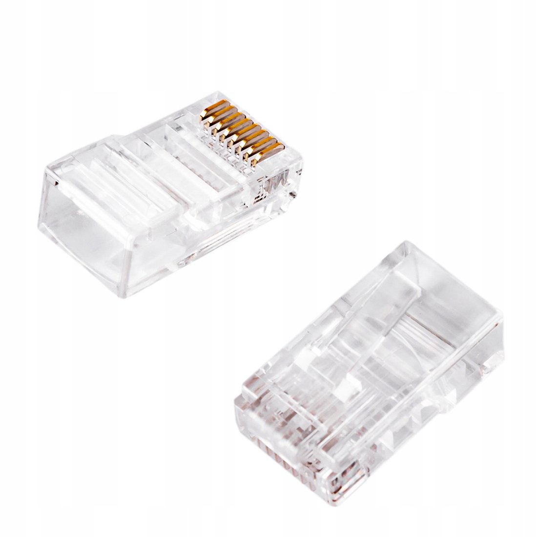 Zestaw 100 szt. standardowych ośmiostykowych wtyków RJ45 przystosowanych do zarabiania kabli teleinformatycznych LAN typu "skrętka". Końcówka jest uniwersalna - można ją stosować zarówno do kabli z żyłami z drutu, jak i linki. Piny wykonane z czystej miedzi ze stykami pokrytymi złotem, co zapewnia doskonałe przewodnictwo. Produkt wykonany w najnowszej technologii z wysokiej jakości materiałów. Zapewniają skuteczne połączenia kabli z gniazdami typu RJ45.