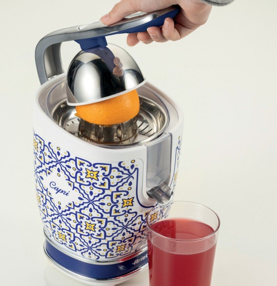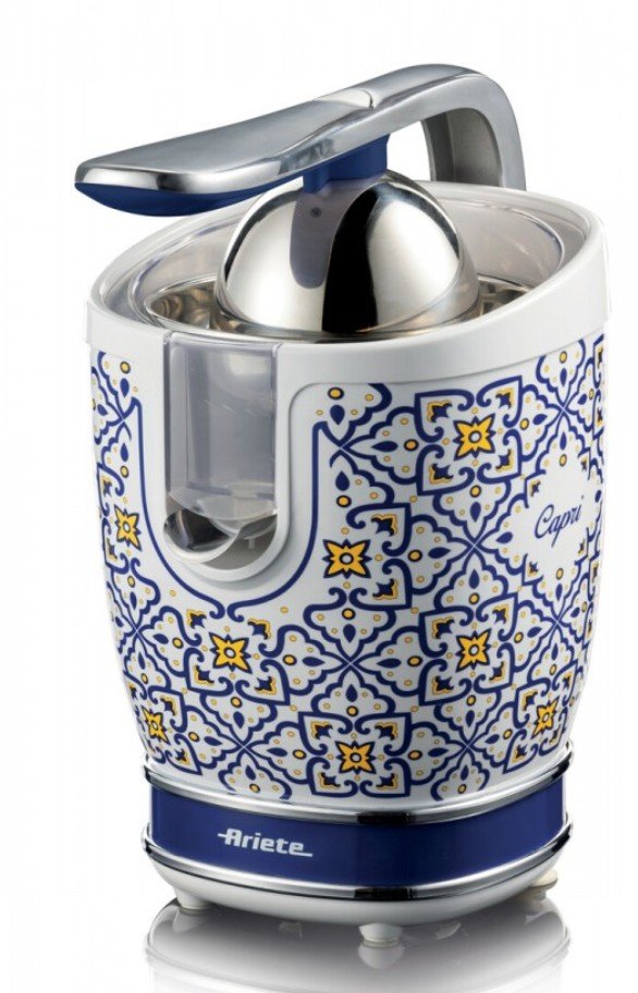 Rozpocznij dzień od szklanki świeżo wyciśniętego soku z cytrusów i poczuj klimat śródziemnomorskiej kuchni dzięki wyciskarce Ariete z linii Capri. Połączenie białej obudowy z głębokimi niebieskimi wzorami i żółtymi akcentami przywołuje na myśl ciepłe dni nad lazurowym morzem. Wyciskarka Capri to nie tylko piękny dodatek do kuchni, ale przede wszystkim funkcjonalne urządzenie, które szybko i łatwo wyciśnie sok z ulubionych cytrusów. Wyjątkowy design i ergonomia urządzenia sprawiają, że przygotowywanie soków staje się prawdziwą przyjemnością.