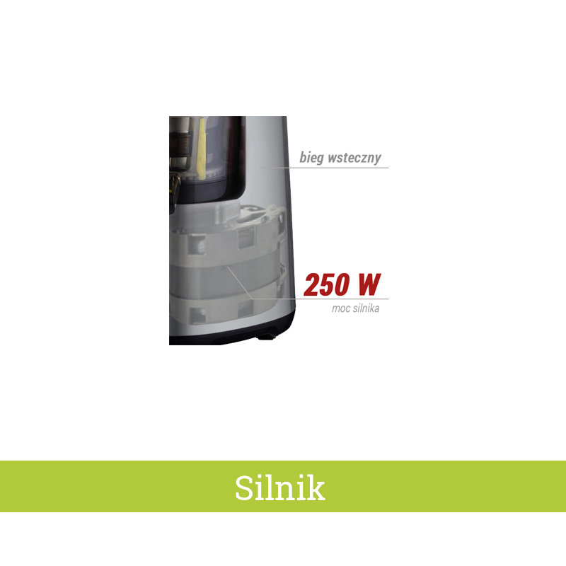 | Wyposażenie: | pojemnik na sok, pojemnik na miąższ, szczoteczka do czyszczenia, pędzelek czyszczący, popychacz, sitka, wałek ślimakowy, książka z przepisami |