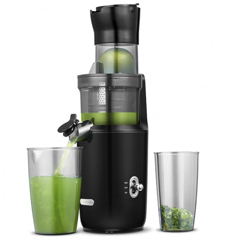 Wyciskarka jest wyposażona w wyjątkowo szeroki otwór o średnicy 78 mm, który umożliwia łatwe wkładanie dużych kawałków owoców i warzyw. Funkcja REWERS umożliwia odblokowanie zakleszczonych owoców lub warzyw, a separator miąższu zapewnia napojom gładką konsystencję. Dzięki innowacyjnemu systemowi ekstrakcji Elixir II gwarantuje delikatny obrót 50-70 obrotów na minutę, zachowując w ten sposób enzymy i witaminy.