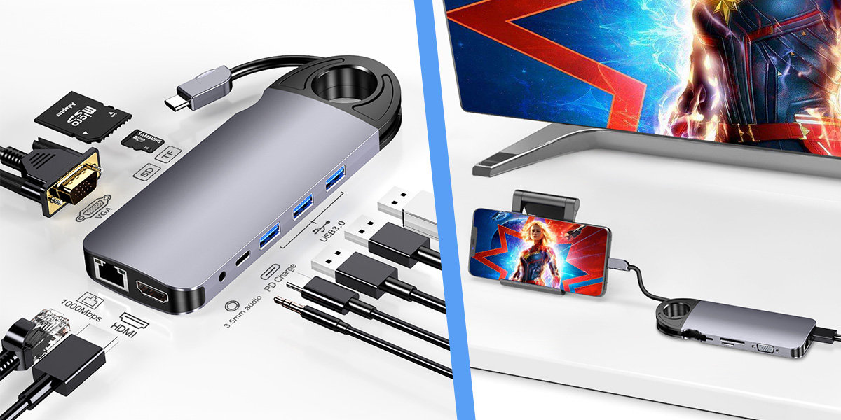 Podwójny interfejs HDMI + VGA dla różnych urządzeń, pozwalający na przesyłanie sygnału za pomocą HDMI do rozdzielczości 4K, oraz VGA do rozdzielczości 1K. Pozwala komputerom, tabletom, telefonom komórkowym i innym urządzeniom łączyć się z telewizorami lub projektorami.3 gniazda USB w multiporcie SPU-M01
