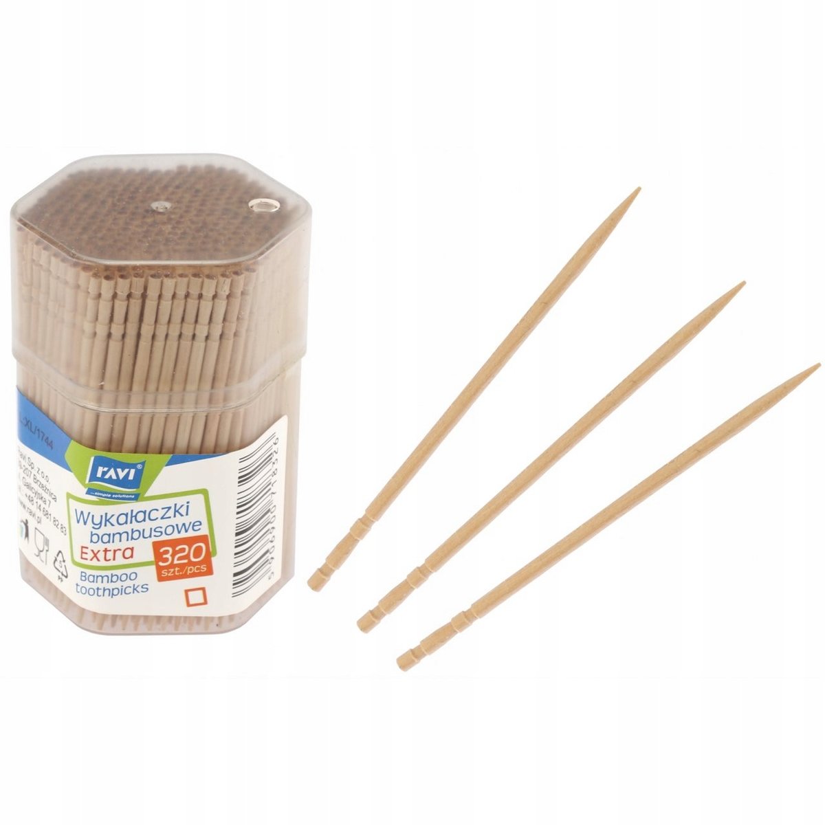 Wykałaczki bambusowe extra w pojemniku 320 szt. Wykałaczki bambusowe marki Ravi przydadzą się podczas serwowania posiłków, a także pomogą przygotować efektowne koreczki na imprezę w gronie przyjaciół
