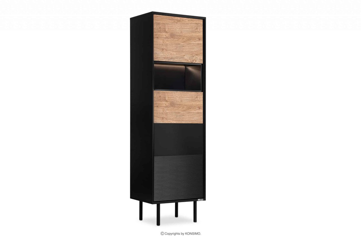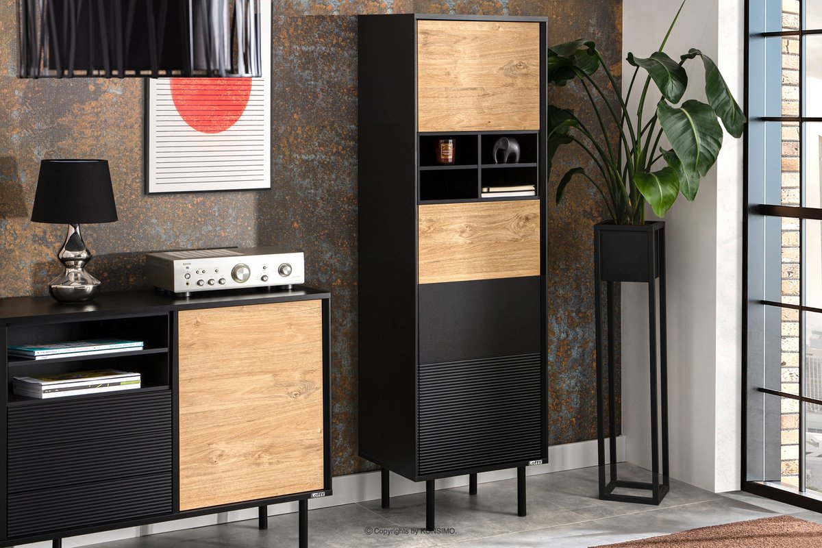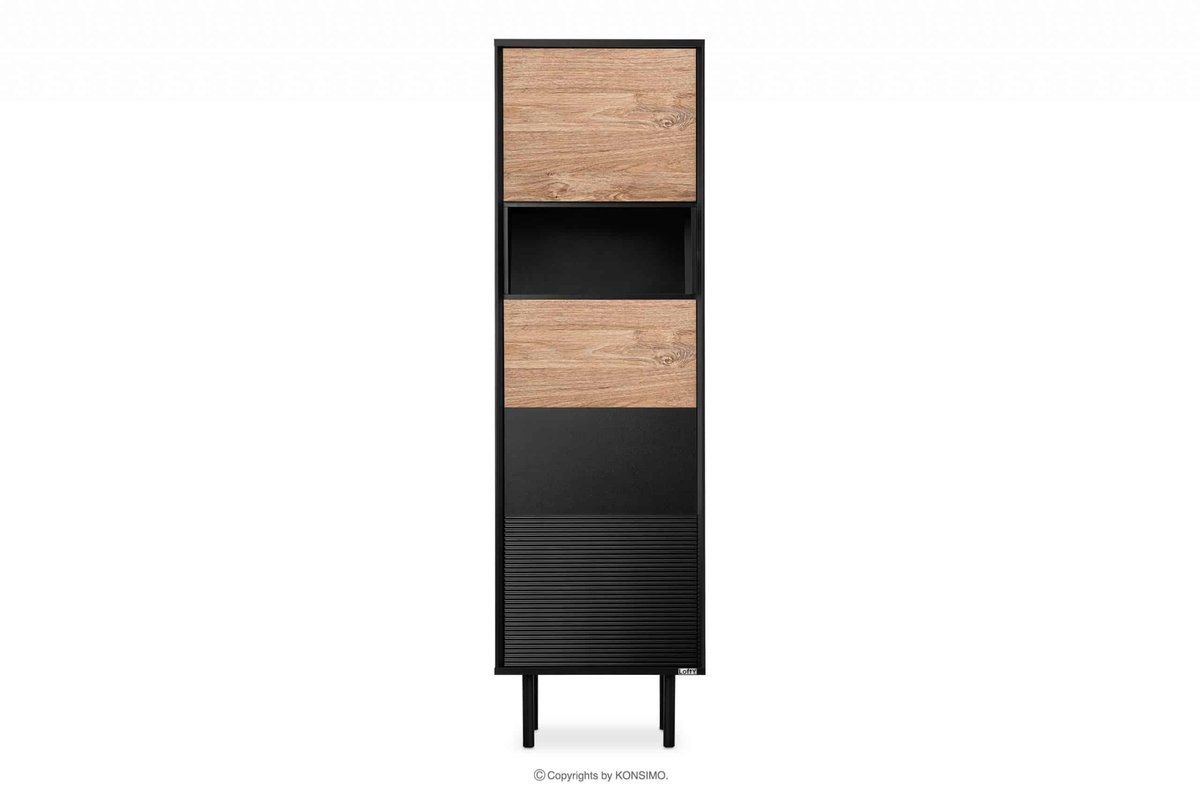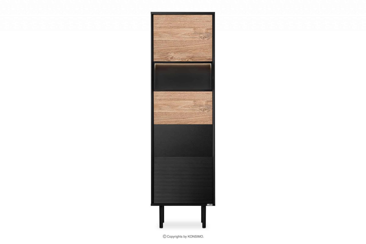 Prezentujemy nowy, wysoki regał w stylu loft z ryflowaniem z kolekcji LOFTY. Mebel ten wykonany jest z trwałej i wysokiej jakości płyty laminowanej o grubości 18 mm. Regał ma kilka zamkniętych półek, pozwalając na przechowywanie różnych przedmiotów codziennego użytku. Dzięki neutralnemu wybarwieniu w kolorze czarnym i dębie naturalnym, regał LOFTY wpasuje się w wiele różnych kolorów ścian i podłóg, idealny do nowoczesnych loftowych wnętrz. Drzwi tego mebla wyposażone są w system push-to-open, co ułatwia ich użytkowanie i zapewnia elegancki i gładki wygląd całego mebla.Regał w stylu loft z ryflowaniem zapewnia lata użytkowania z zachowaniem wysokiej jakości i trwałości, a jego wymiary to 51,5x174x41 cm. Dodatkowo, opcjonalnie, można wyposażyć go w oświetlenie LED (12607.15.147), co z pewnością doda mu elegancji i nowoczesnego wyglądu.