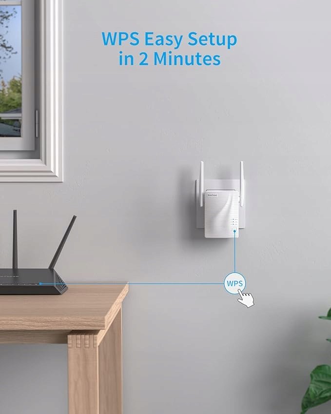 Naciśnij przycisk WPS na istniejącym routerze/bramie, a ten przedłużacz WiFi natychmiast rozszerzy zasięg sieci w ciągu 8 sekund. Możliwa alternatywna konfiguracja przez przeglądarkę internetową na komputerze lub smartfonie.