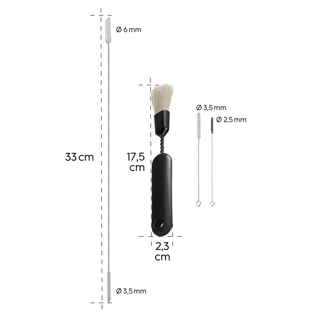 Oprócz ekspresów do kawy, nasz zestaw szczotek do czyszczenia doskonale sprawdzi się przy myciu delikatnych naczyń, słomek wielokrotnego użytku, butelek dla niemowląt czy probówek, co czyni go niezwykle praktycznym dodatkiem do każdej kuchni. Wszystkie elementy zestawu są przystosowane do mycia w zmywarce.