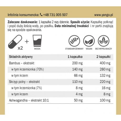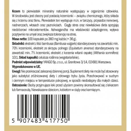 Składniki: Ekstrakt z nasion liścia bambusa (Bambusa vulgaris) standaryzowany na zawartość min. 70% krzemionki, ekstrakt ze skrzypu polnego (Equisetum arvense) standaryzowany na zawartośc min. 7% krzemionki, ekstrakt z korzenia witanii ospałej (Withania somnifera) 10:1 Skład kapsułki: celuloza roślinna (wegetariańskie) Podmiot odpowiedzialny: YANGO Sp. z o.o. ul. Granitowa 3/14, 02-681 Warszawa. Wyprodukowano w UE.