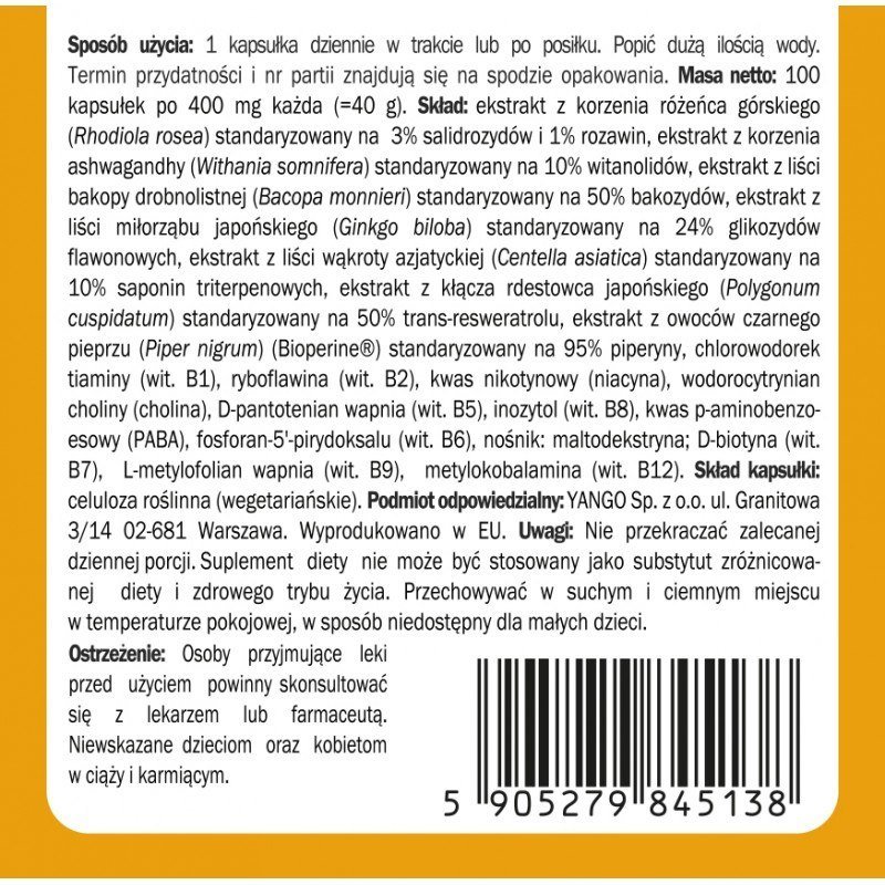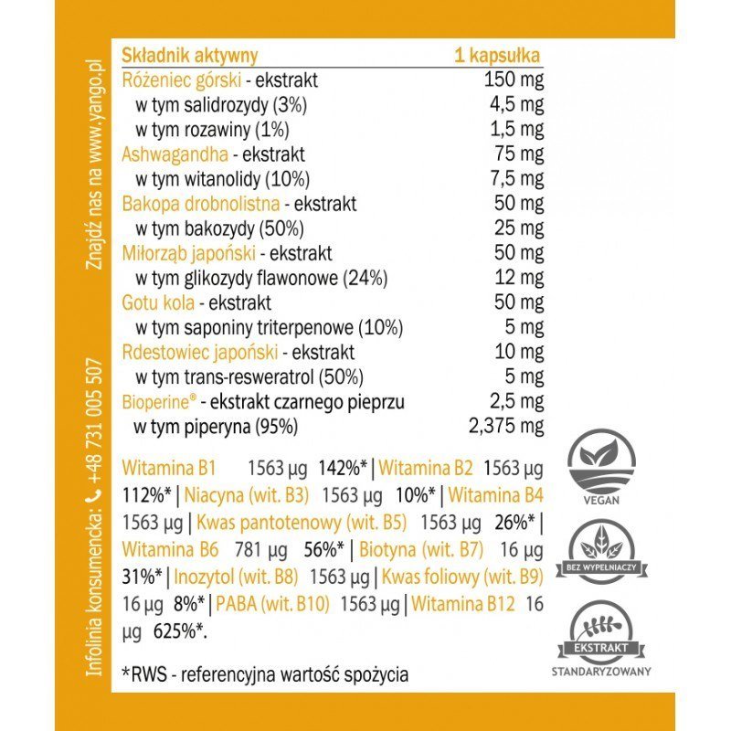 - połączony z ekstraktami z ashwagandhy, brahmi, gotu koli, ginkgo biloba, rdestu japońskiego, pieprzu czarnego oraz witaminami z grupy B