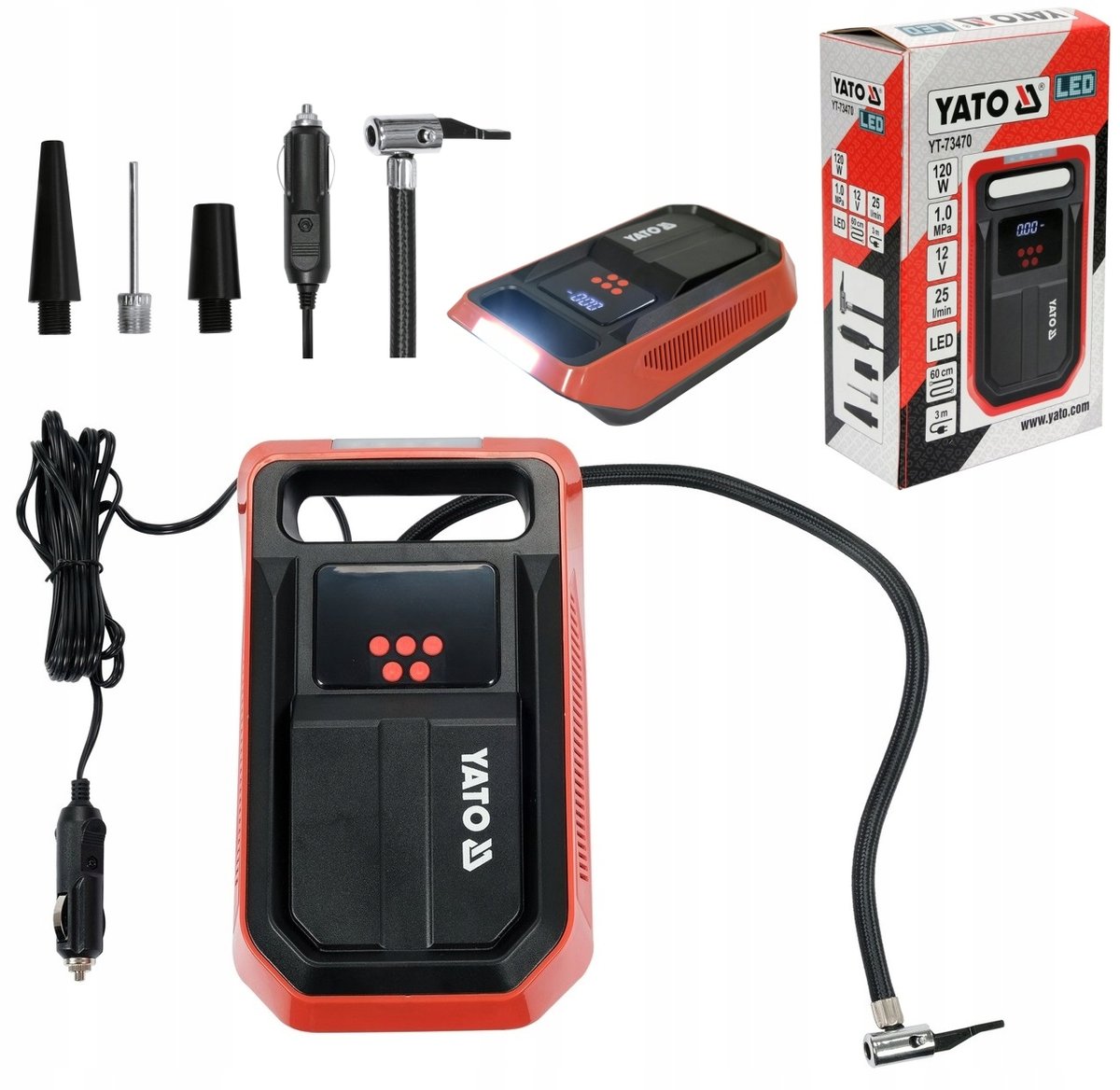 Kompresor samochodowy z elektronicznym wyświetlaczem i lampami LED YATO YT-73470 przeznaczony jest do pompowania kół i dętek w samochodach, rowerach, motocyklach, materacach, pontonach i piłkach. Dzięki możliwości pobierania zasilania bezpośrednio z zapalniczki samochodowej użytkownik może pracować z większą wydajnością. Wbudowana diody LED pozwalają prowadzić działania także w ciemnościach. Uchwyt transportowy sprawia, że przenoszenie urządzenia jest wygodne i bezproblemowe.Dane techniczne: Moc: 120W Zasilanie: 12V Ciśnienie maksymalne: 150 PSI Przepływ powietrza: 25l/m Długość przewodu zasilającego: 3m Manometr elektroniczny w formie wyświetlacza