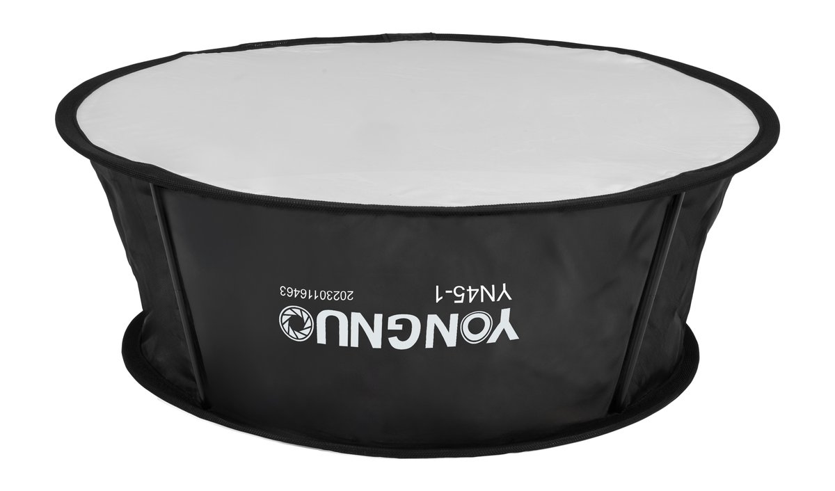 Po wyjęciu softobxa Yongnuo YN45-1 z dołączonego do zestawu pokrowca, wystarczy jeden ruch ręki, aby konstrukcja o średnicy 45 cm została rozłożona. Modyfikator światła połączysz z lampą za pomocą solidnych rzepów. Montaż i demontaż softboxa jest prosty i szybki, dzięki czemu możesz skoncentrować się na swojej pracy, bez