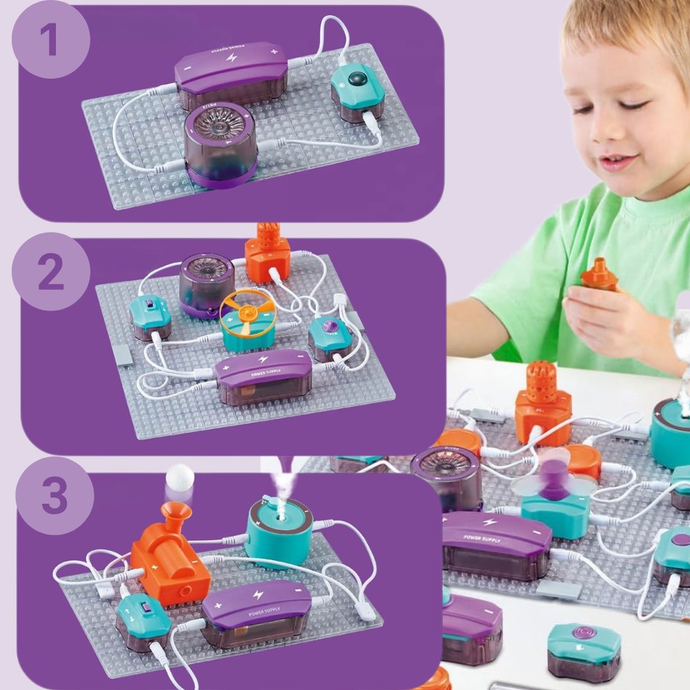 Zwykła zabawka? Nie tym razem. Ten zestaw to mini laboratorium elektroniki, dzięki któremu dziecko nie tylko buduje – ono konstruuje działające obwody, generuje prąd, uruchamia światło, dźwięk, wiatr i nawet unoszące się kulki!