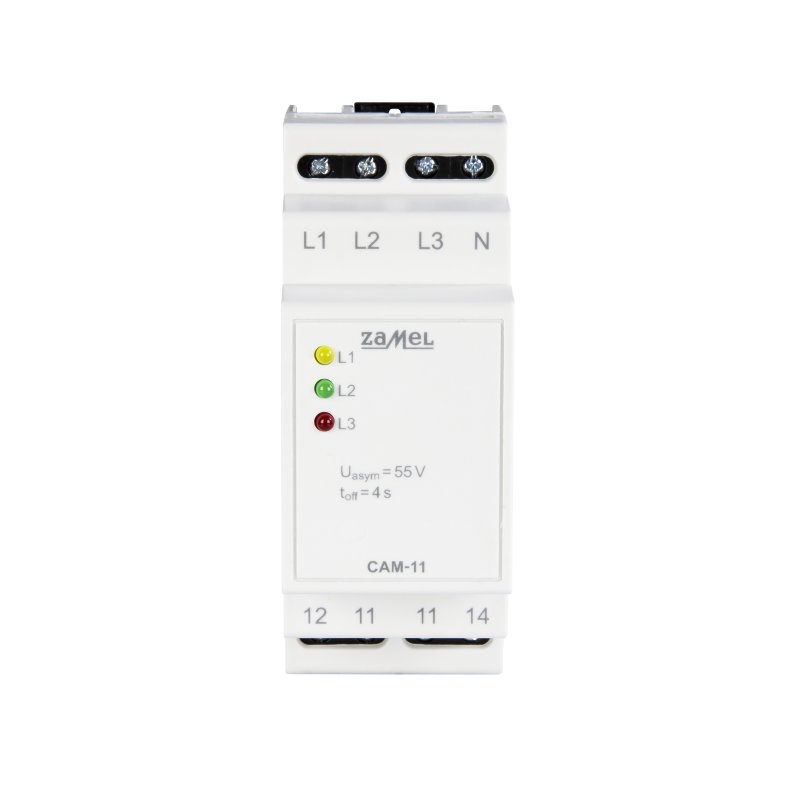 Czujnik asymetrii napięcia CAM-11 służy do zabezpieczenia urządzeń zasilanych z sieci trójfazowej (np. silniki) przed uszkodzeniem, w przypadku zaniku napięcia fazowego lub asymetrią napięć fazowych. Wartość progu asymetrii ustawiona jest fabrycznie na poziomie 55 V. Czujnik zabezpiecza również przed symetrycznym spadkiem napięcia wyłączając przekaźnik jeżeli na którejkolwiek fazie napięcie spadnie poniżej 150 V (niezależnie od poziomu asymetrii). Urządzenie zasilane jest z dowolnej fazy co sprawia, że wystarczy obecność napięcia na jednej fazie aby było one w pełni funkcjonalne. Wynoszące 4 s opóźnienie wyłączenia oraz histereza napięciowa powodują, że czujnik jest odporny na krótkotrwałe wahania napięcia.