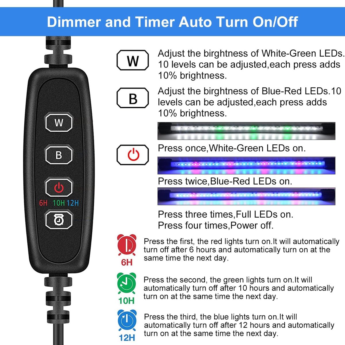 【4-kolorowe koraliki lampowe i 10 poziomów regulacji jasności】Nowa lampa do akwarium ma 18 diod LED - 96 diod LED, 19 cm - 112 cm. Jasność i przełączniki biało-zielonych, czerwono-niebieskich diod LED można zdefiniować od 10% do 100% indywidualnie lub jednocześnie. Naciśnij przycisk „W”, aby wyregulować biało-zielone światła i naciśnij przycisk „B”, aby wyregulować czerwono-niebieskie światła. 10-biegowy cykl przyrostowy.