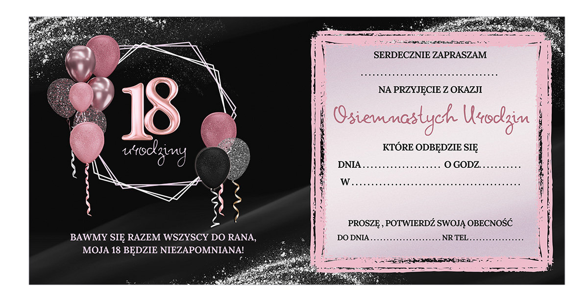 Stylowe zaproszenia na 18 urodziny, które przyciągają wzrok elegancką kolorystyką różu, czerni i srebra. Na przodzie królują różowe i brokatowe balony, nadając zaproszeniom lekkości i radosnego charakteru. Centralnym elementem jest subtelna cyfra 18, podkreślająca wyjątkowość tego jubileuszu. Wewnątrz znajduje się miejsce na wpisanie wszystkich niezbędnych informacji oraz zaproszenie do wspólnej zabawy do białego rana. To idealny wybór dla osób, które chcą, by ich osiemnaste urodziny były niezapomnianym wydarzeniem.