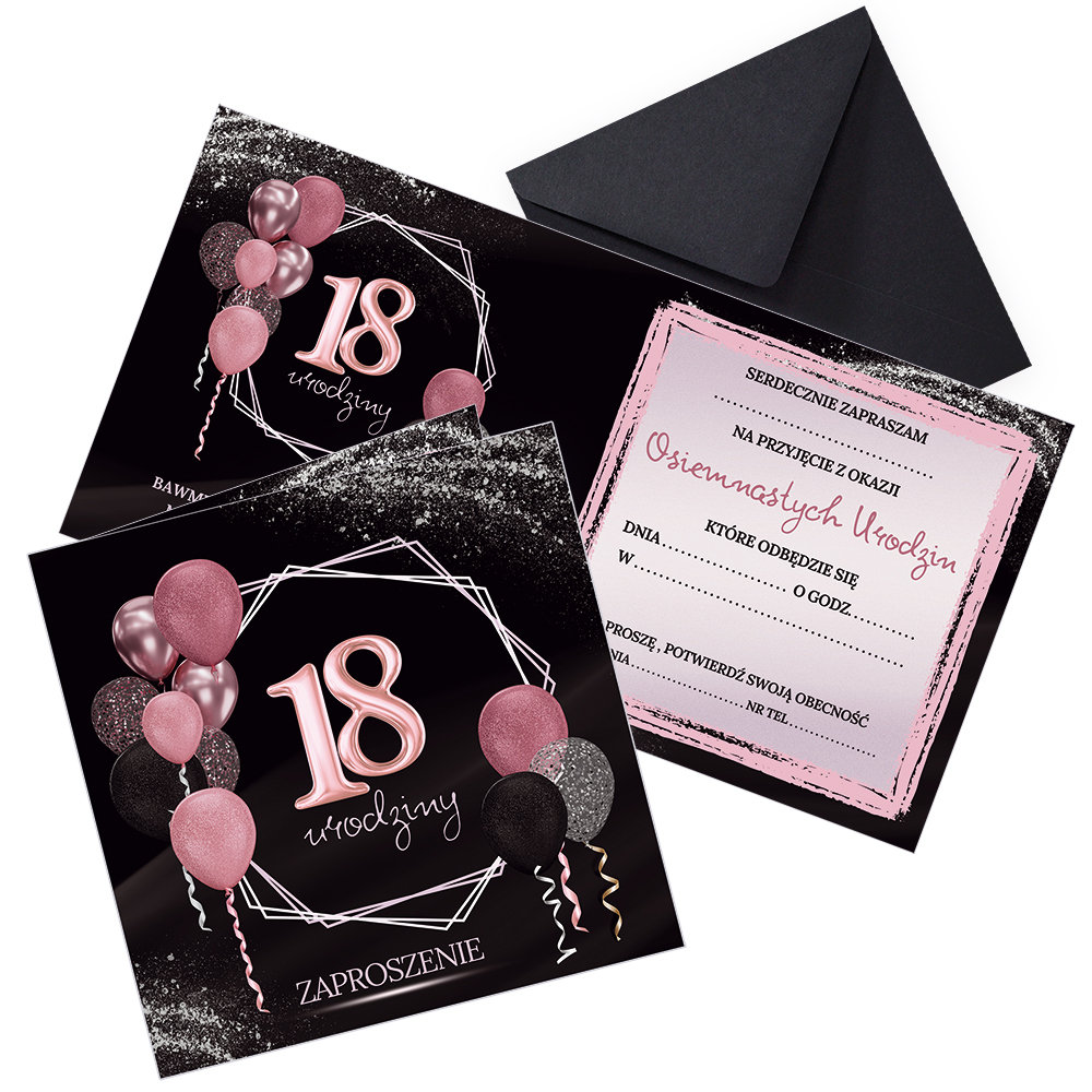 | Nazwa: | Zaproszenia na 18 Urodziny Różowy Blask Czarna Koperta - 10 sztuk |