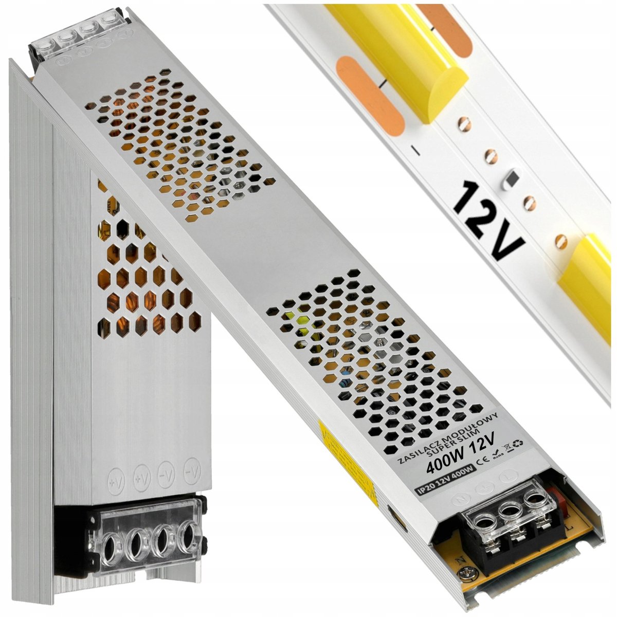 | Nazwa: | Zasilacz Transformator LED 12V 400W 33,33A IP20 Wąski Do Taśmy LED COB 12V |