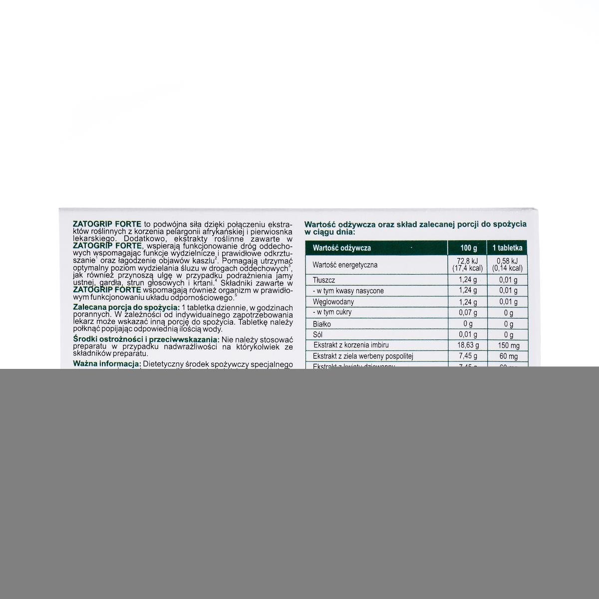 Zatogrip forte 12+ to suplement diety w postaci tabletek, którego cenna formuła została opracowana z myślą o dzieciach powyżej 12 roku życia oraz dorosłych. Preparat łączy w składzie ekstrakty roślinne, w tym standaryzowany ekstrakt korzenia pelargonii afrykańskiej, ekstrakt z kwiatu czarnego bzu i ekstrakt pierwiosnka lekarskiego z wysoką zawartością witaminy D w formie cholekalcyferolu oraz cynku w organicznej postaci glukonianu.