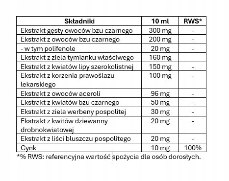 Skład: Woda, miód nektarowy wielokwiatowy, ekstrakt gęsty z owoców bzu czarnego (Sambucus nigra), ekstrakt z owoców bzu czarnego (Sambucus nigra), ekstrakt z kwiatów lipy szerokolistnej (Tilia platyphyllos), ekstrakt z ziela tymianku właściwego (Thymus vulgaris), ekstrakt z korzenia prawoślazu lekarskiego (Althaea officinalis), ekstrakt z owoców aceroli (Malpighia punicifolia), ekstrakt z kwiatów bzu czarnego (Sambucus nigra), mleczan cynku (cynk). naturalny aromat malinowy, ekstrakt z ziela werbeny pospolitej (Verbena officinalis), substancja konserwująca sorbinian potasu, ekstrakt z kwiatów dziewanny drobnokwiatowej (Verbascum thapsus), ekstrakt z liści bluszczu pospolitego (Hedera helix), regulatory kwasowości kwas askorbinowy, kwas cytrynowy.