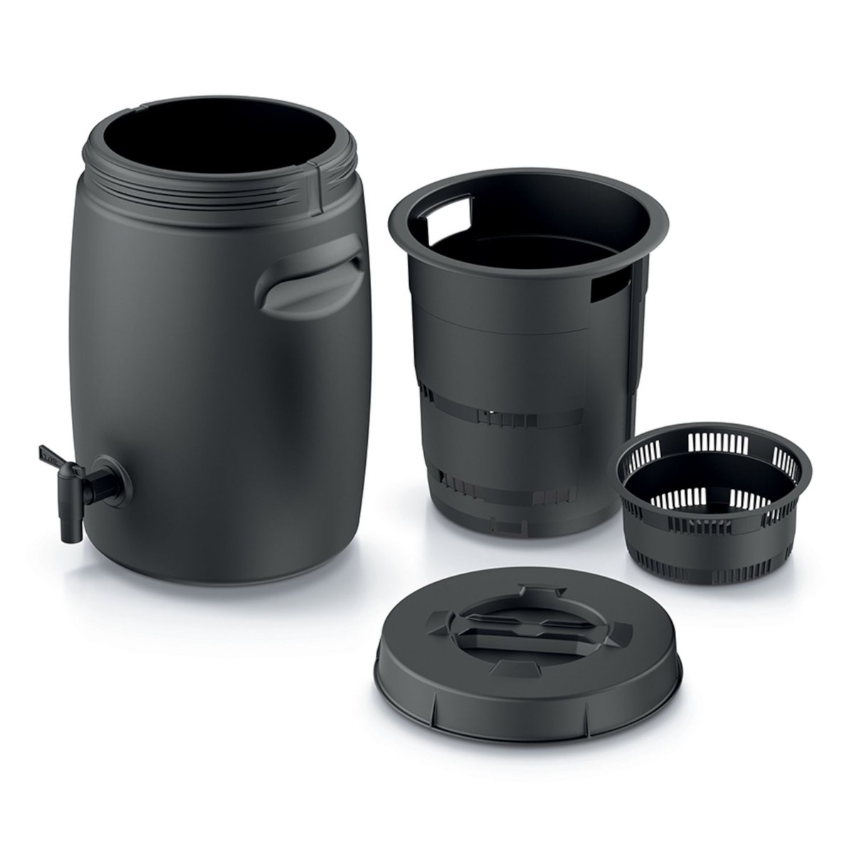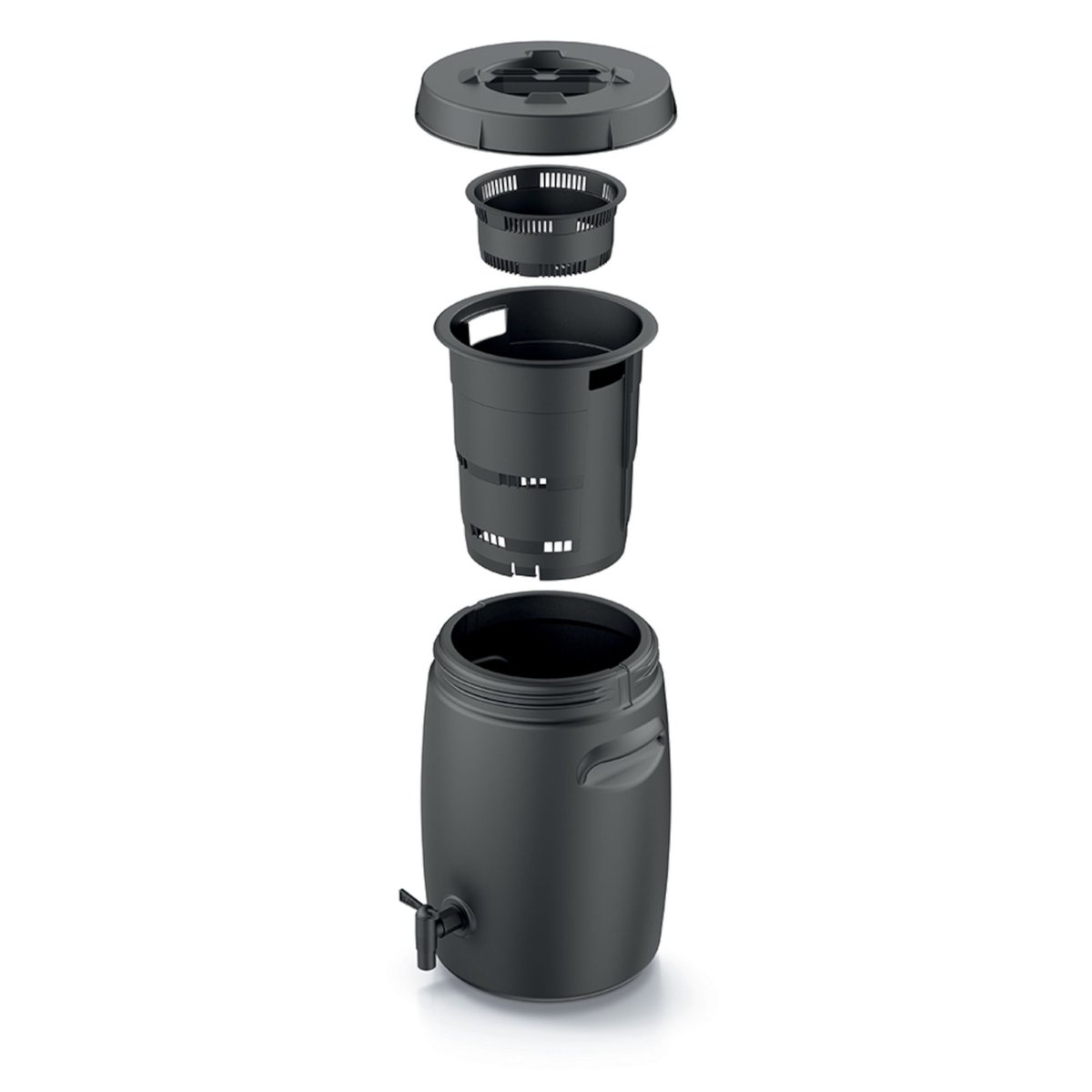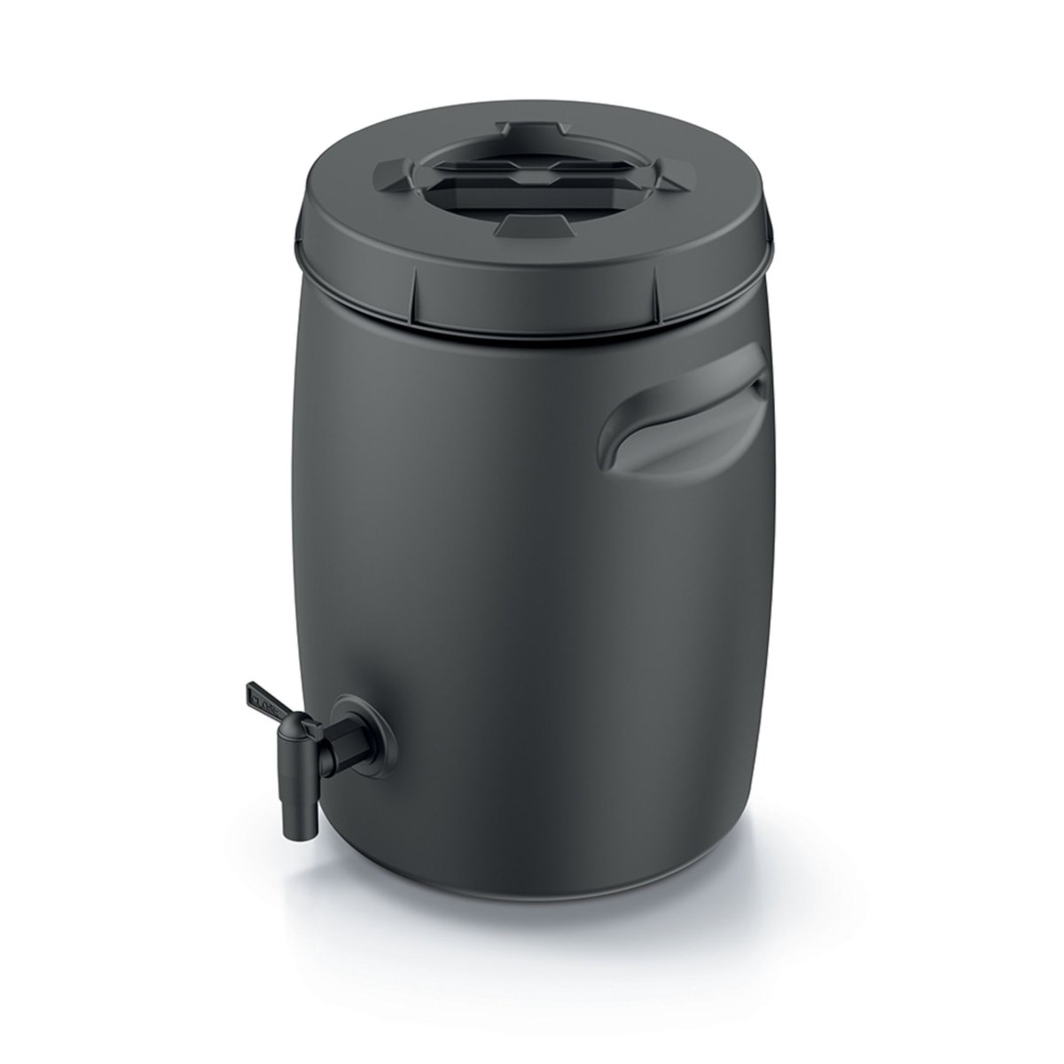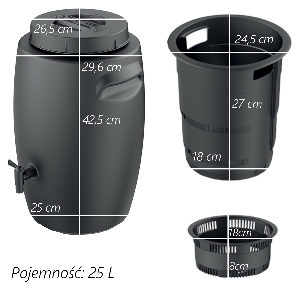 Tworzywo z którego jest wykonany pojemnik ma bardzo wysoki współczynnik odporności na warunki atmosferyczne, więc zimą nie musisz się o niego martwić. Składa się z pięciu części. Obudowy, dwóch wkładek, wieczka oraz kranika.