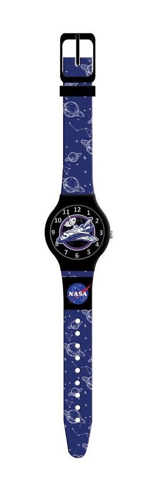 Zegarek analogowy z motywem amerykańskiej agencji kosmicznej NASA. Długość zegarka z paskiem: 22,5 cm. Średnica tarczy z obudową: 3,5 cm.