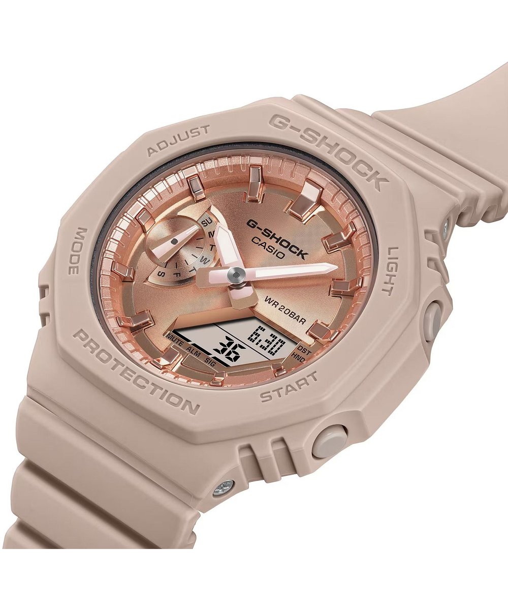 Casio G-SHOCK Carbon Core Guard "CasiOak" GMA-S2100MD-4AER to stylowy, damski zegarek sportowy. Koperta z żywicy wzmocnionej włóknem szklanym jest połączona z gumowym paskiem w beżowym kolorze. Tarczę w odcieniu różowego złota udekorowano szlifem słonecznym, ponadto zabezpieczono ją szkiełkiem mineralnym. Model zawiera takie udogodnienia, jak m.in. stoper, kalendarz automatyczny, czas światowy i wiele innych. Urządzenie działa w oparciu o mechanizm kwarcowy.