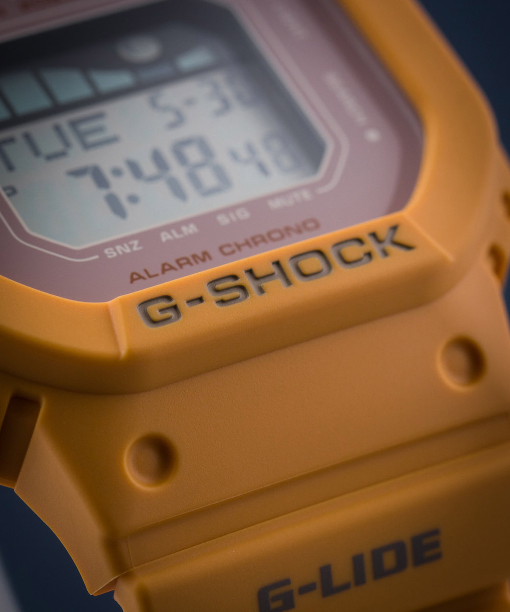 Zegarek Casio G-SHOCK G-Lide Bluetooth Sync Step Tracker GLX-S5600-4ER w kolorze pomarańczowym doda Ci stylu. Ten niezwykły model jest dedykowany surferom. Tarcza w nostalgicznym klimacie plaży została zabezpieczona szkiełkiem mineralnym. Produkt wyposażono w Auto-Illuminator, system wstrząsoodporny, Display Flasher, fazy księżyca, wskaźnik przypływów i odpływów, czas światowy, stoper - 1/100 sek. - 24h, timer - 1/1 min. - 24h (z autopowtarzaniem), 3 multialarmy, funkcje drzemki, sygnały przycisków on/off, kalendarz automatyczny i format 12-/24-godzinny. Wodoszczelność oszacowano na poziomie 20 ATM.