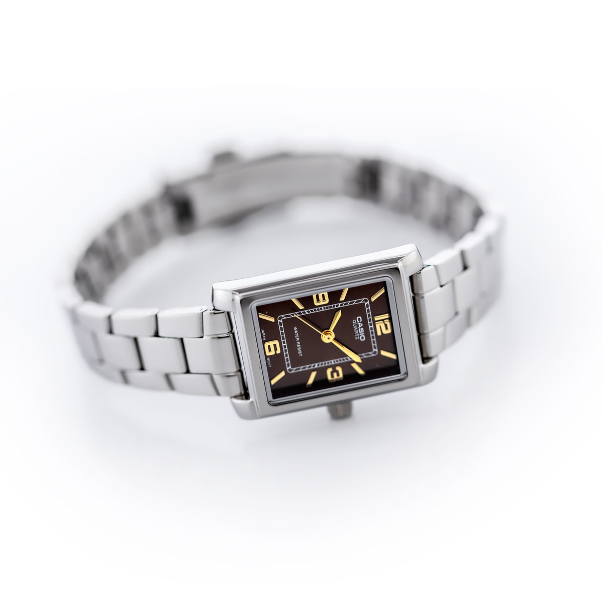 Zegarek CASIO LTP-1234DD-5A wyróżnia się elegancją prostokątnej koperty i minimalistycznym designem. Jego niezawodność oparta jest na precyzyjnym japońskim mechanizmie kwarcowym, cenionym w świecie zegarmistrzowskim za doskonałą dokładność.