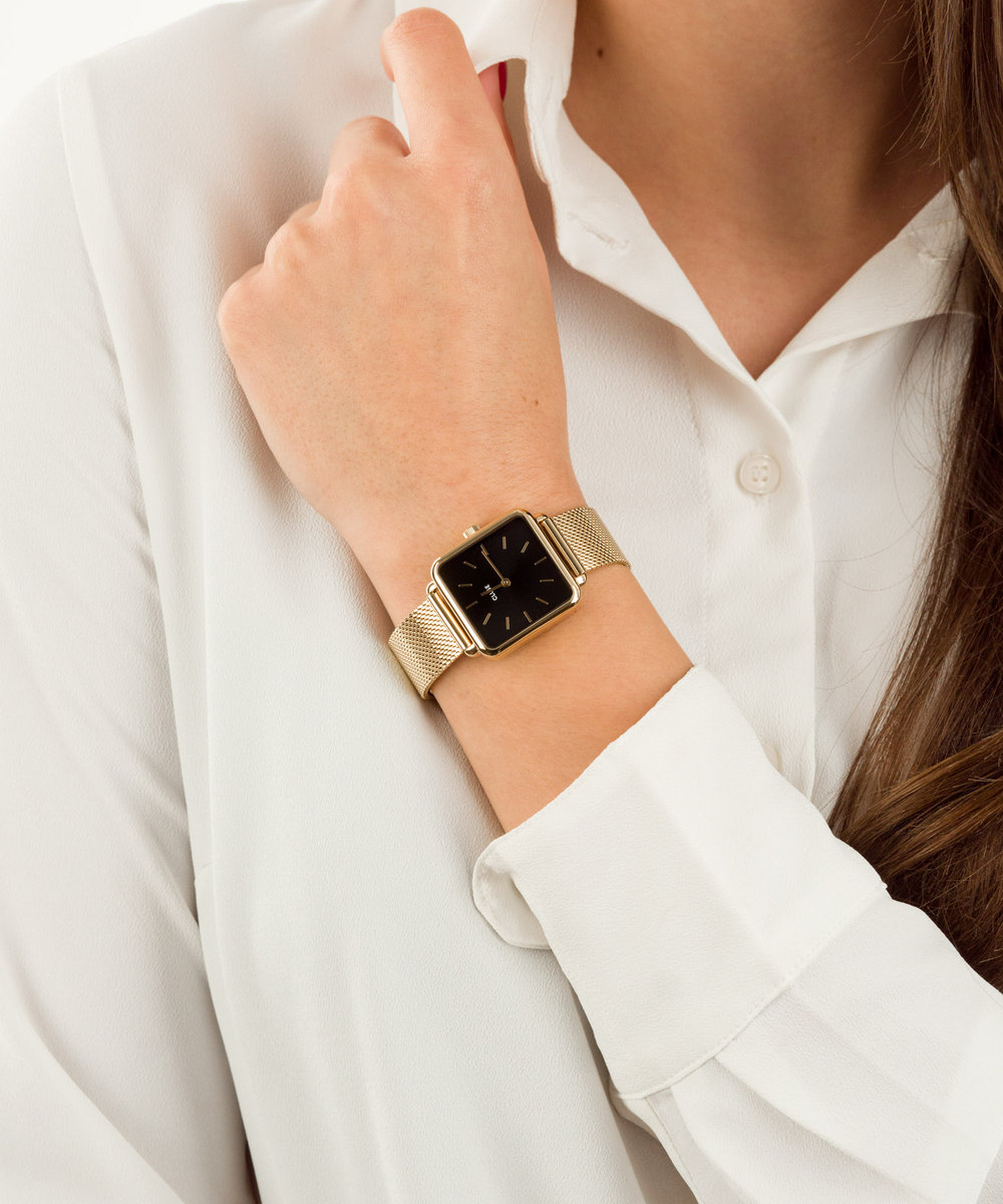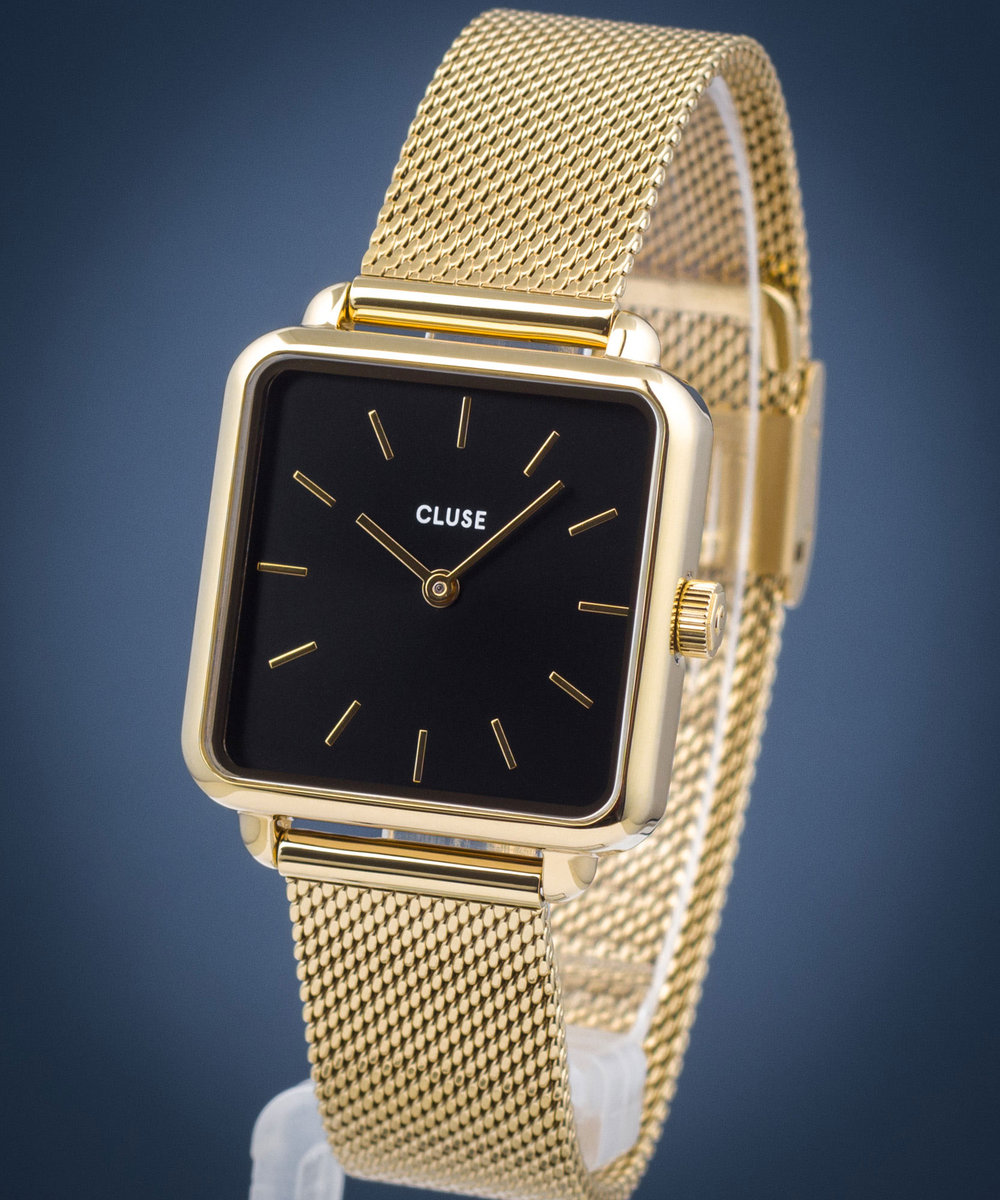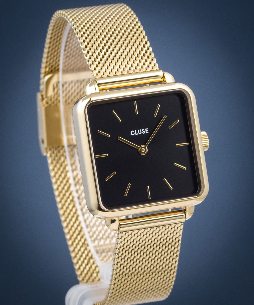 Cluse La Tetragone CW10308 to klasyczny damski zegarek, który posiada modną kwadratową kopertę, która została wykonana tak samo, jak i bransoleta mesh ze stali szlachetnej o złotej barwie. Czarną ...