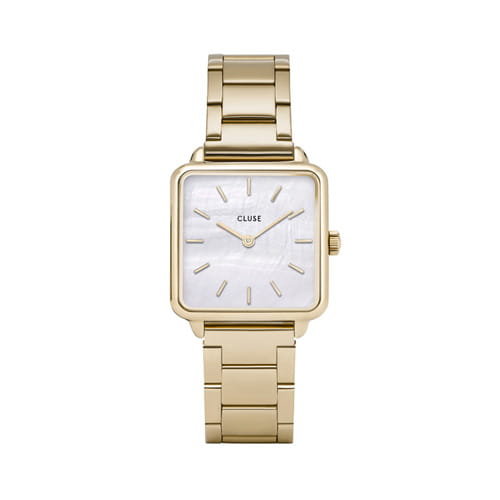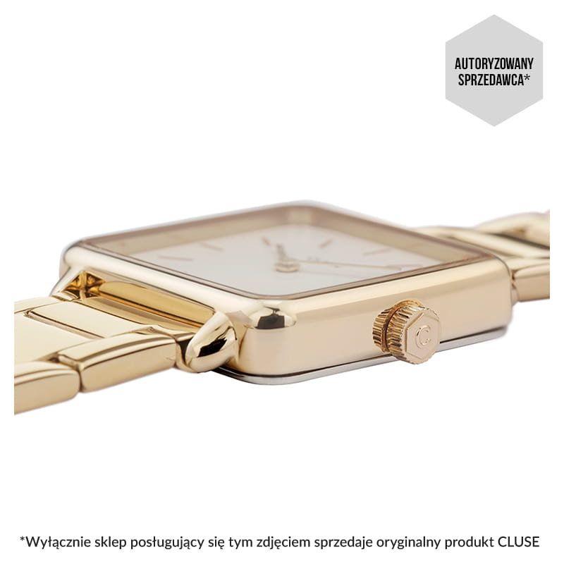 Nad wyraz udane połączenie klasycznego prostokątnego kształtu i nowoczesnego minimalizmu. Koperta wykonana została ze stali nierdzewnej a następnie pokryta powłoka w barwie klasycznego, żółtego złota. Piękna perłowa tarcza nadaje całości wyjątkowo szykownego charakteru. Zarówno wskazówki jak i indeksy są koloru złotego. Uwagę przyciąga również misternie wykonana bransoleta. prostokątne ogniwa nadają jej wrażenia masywności. Wykonany został w klasie wodoszczelności 3 ATM więc żaden deszcz nie jest mu straszny. Nad dokładnością wskazań czuwa tu precyzyjny mechanizm kwarcowy. To nietuzinkowy dodatek, który stanowi uosobienie uniwersalności będącej już znakiem rozpoznawczym zegarków Cluse. Bez problemu wkomponujemy go zarówno w eleganckie jak i casualowe stylizacje.