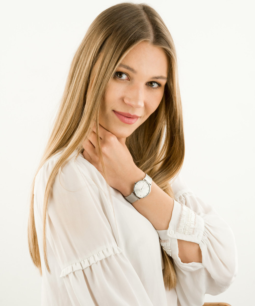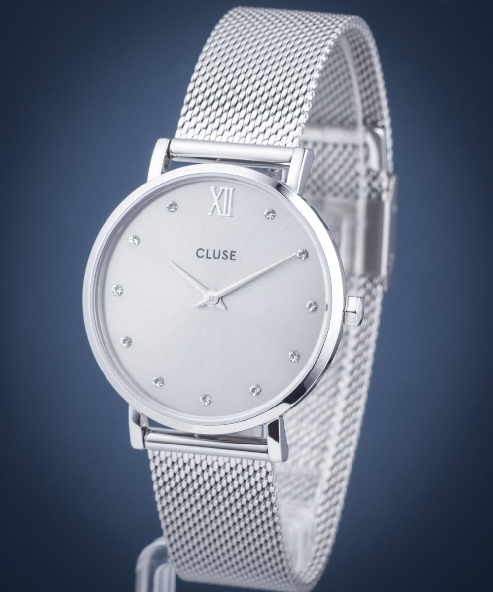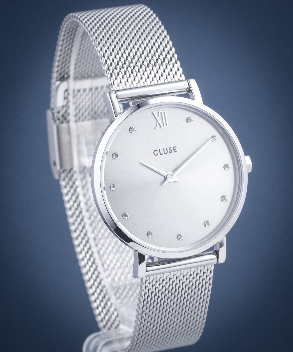 Cluse Minuit CW10203 to minimalistyczny zegarek dla kobiet. Na budowę tego subtelnego modelu składają się koperta i bransoleta mesh wykonane ze srebrnej stali szlachetnej, rozświetlona szlifem słonecznym tarcza w kolorze szarym oraz chroniące ją szkło mineralne. Funkcję indeksów pełnią połyskujące kryształki. Godzina dwunasta ma postać rzymską.