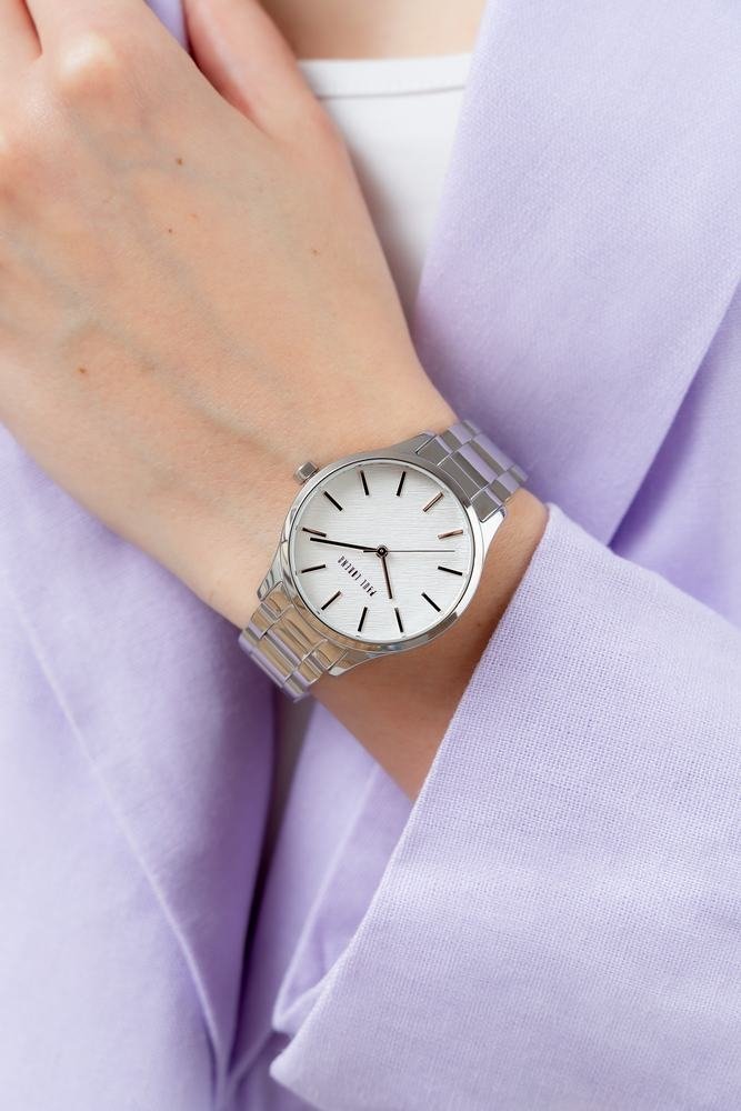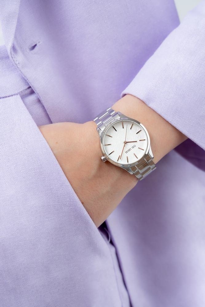 Jej gładka, delikatnie połyskująca powierzchnia harmonijnie oplata nadgarstek, zapewniając komfort noszenia przez cały dzień. Dzięki precyzyjnemu wyprofilowaniu idealnie dopasowuje się do kobiecej dłoni, subtelnie podkreślając smukłość nadgarstka i dodając każdej stylizacji elegancji. Stal nierdzewna łączy w sobie zarówno wytrzymałość, jak i lekkość, co sprawia, że zegarek nosi się z wyjątkową wygodą. Design bransolety idealnie balansuje pomiędzy luksusem a codzienną prostotą, sprawiając, że ten model zegarka jest idealny zarówno na wieczorne wyjścia, jak i na co dzień. Całość dopełnia logo Paul Lorens na zapięciu bransolety.