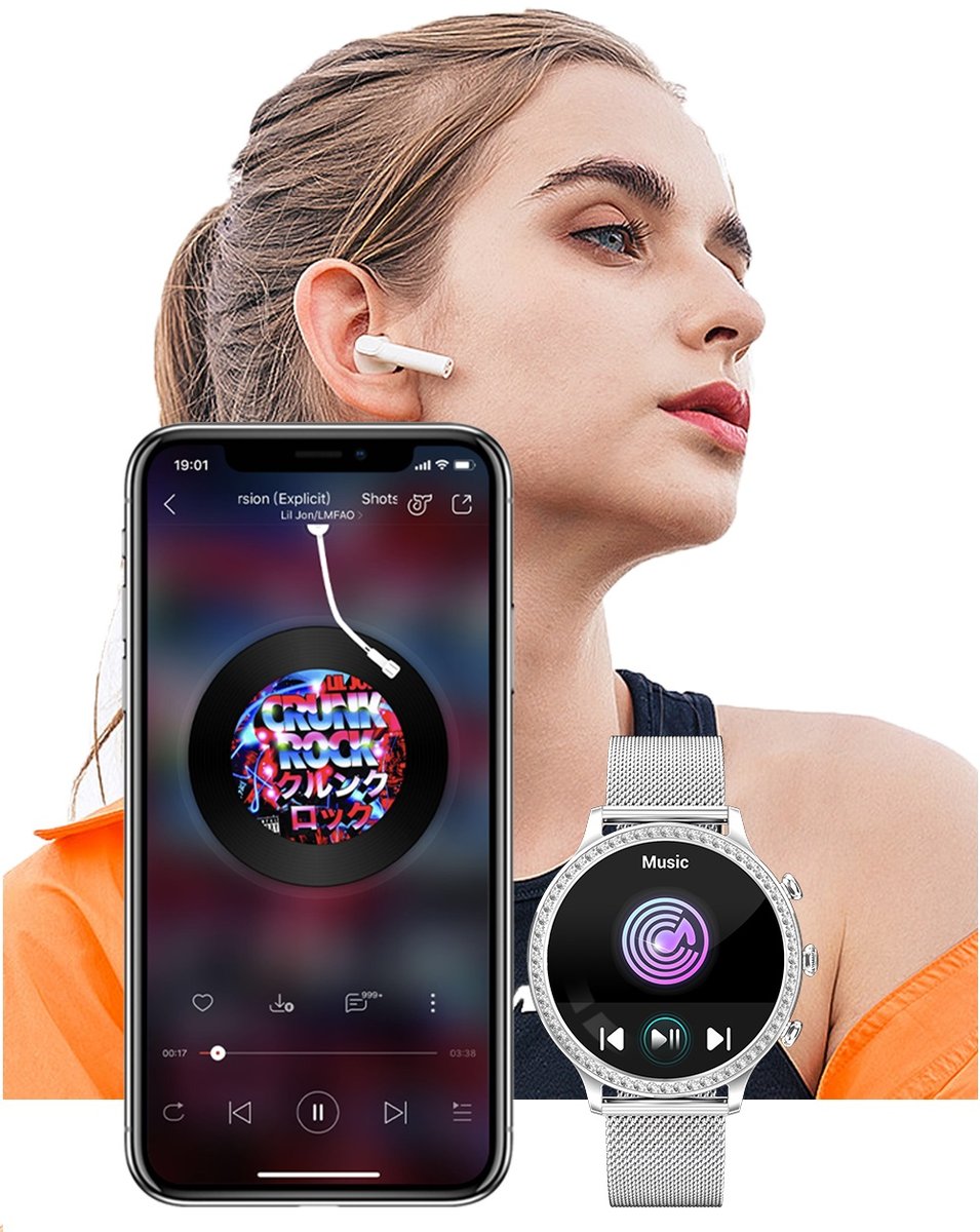 Smartwatch wyposażony w wydajny system Bluetooth 5.1, może odbierać/wykonywać/odrzucać połączenia bez karty SIM. Wbudowany głośnik stereo Hi-Fi i mikrofon z redukcją szumów przywracają prawdziwy dźwięk. Smartwatch wibracjami informuje o wiadomościach z SMS, WhatsApp, Skype lub innych aplikacji. Możesz także słuchać muzyki za pośrednictwem smartwatcha i cieszyć się kolorowym, inteligentnym życiem.