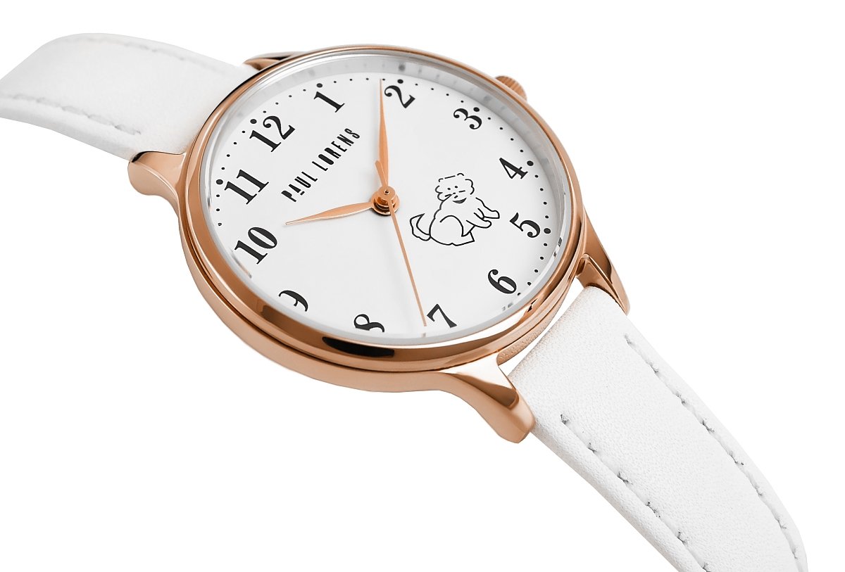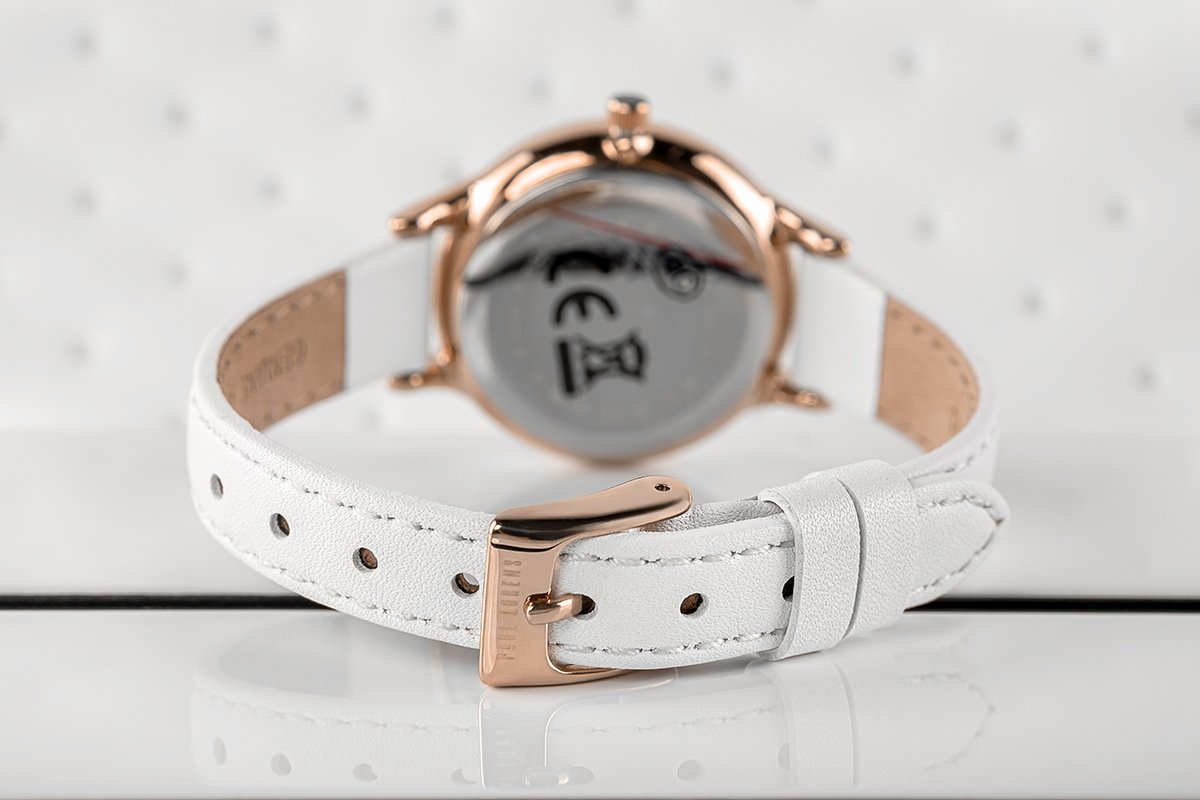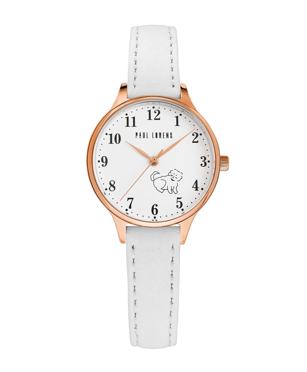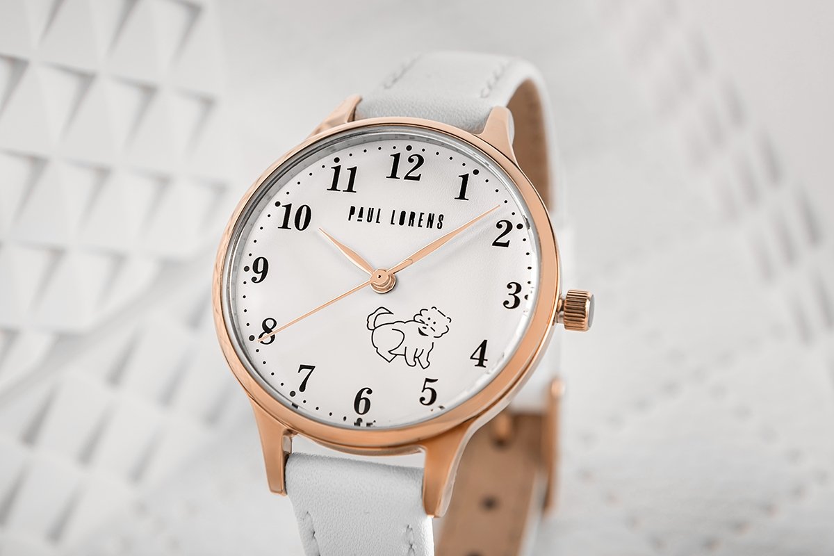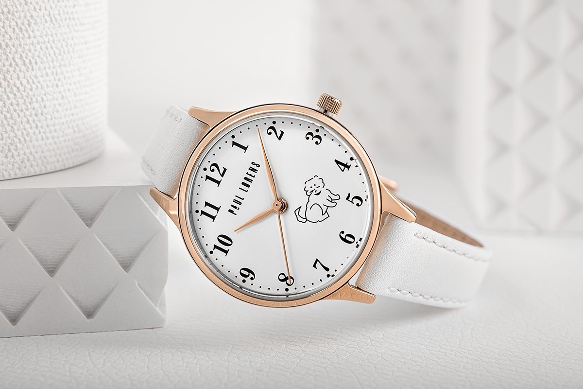 Koperta w kolorystyce różowego złota harmonijnie współgra z białą tarczą, na której widnieje uroczy wizerunek pieska, dodając zegarkowi radosnego charakteru. Ta subtelna grafika sprawia, że zegarek staje się wyjątkowym, osobistym akcesorium, które maluch będzie nosił z dumą. Wskazówki i indeksy w różowym złocie dodają elegancji, a sprytnie zaprojektowany sekundnik, poruszający się z gracją, uczyni naukę odczytywania czasu przyjemnością i ekscytującą przygodą.
