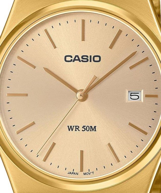 Casio Classic MTP-B145G-9AVEF to stylowy męski zegarek. Wyposażona w datownik dni miesiąca tarcza została osadzona w okrągłej kopercie ze stali szlachetnej pokrytej złotą powłoką PVD. Całość uzupełnia elegancka bransoleta z tego samego materiału. Model działa w oparciu o mechanizm kwarcowy, którego bateria działa około dwóch lat. Co więcej, produkt zawiera wodoszczelność w klasie 50 m oraz szkiełko mineralne.