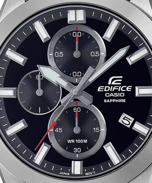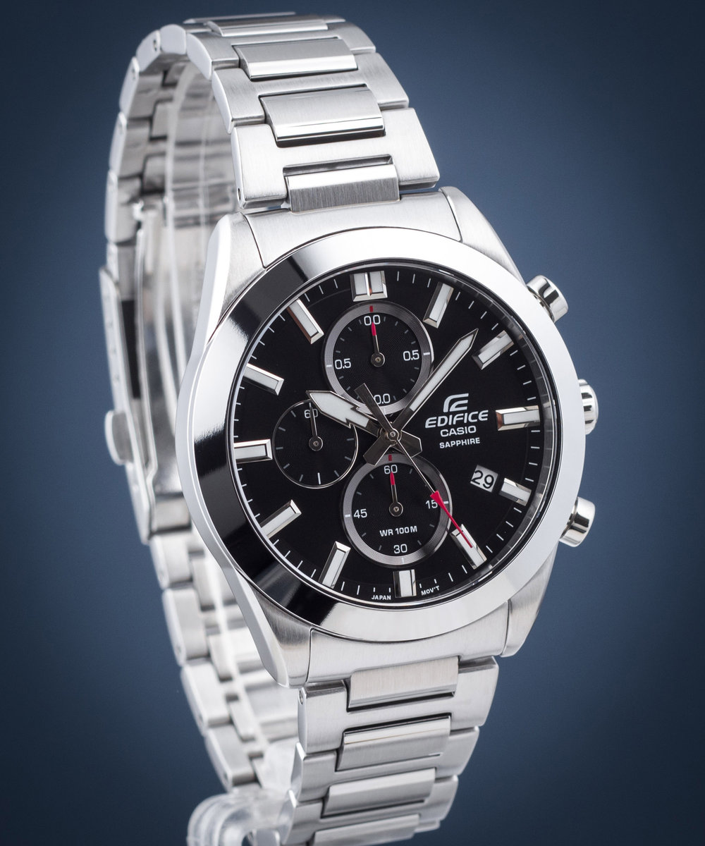 Męski zegarek Casio EDIFICE Chronograph EFB-710D-1AVUEF wykonano ze stali szlachetnej w kolorze srebrnym. Na czarnej tarczy znajduje się chronograf, datownik dni miesiąca oraz wskazówki i indeksy liniowe z powłoką Neobrite. Cyferblat zabezpieczono szkłem szafirowym. Wodoszczelność w klasie 10 ATM pozwala na pływanie powierzchniowe. Całość działa w oparciu o mechanizm kwarcowy.