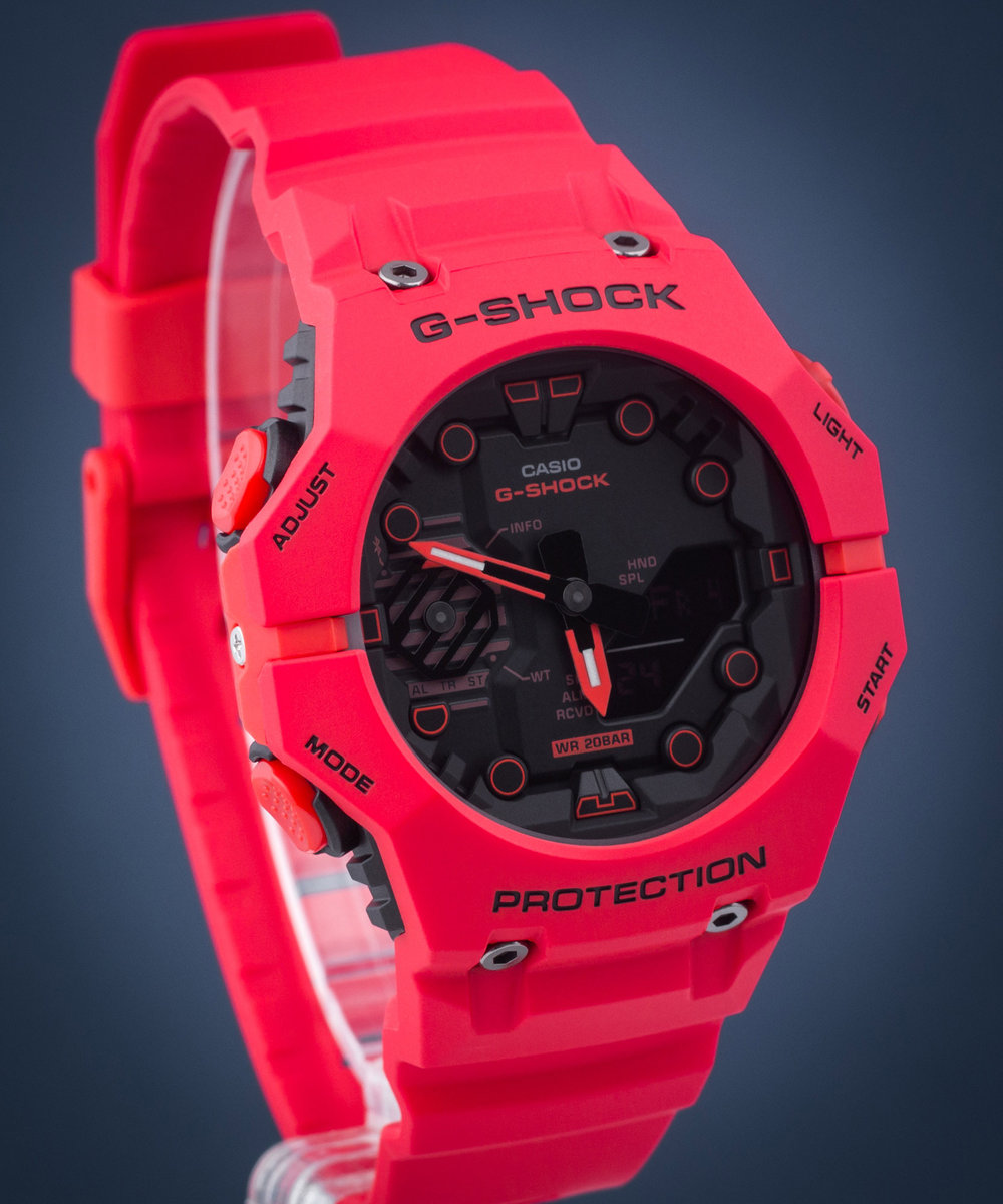 Sprawdzone funkcje, solidne wykonanie i wytrzymałość to must have każdego zegarka przeznaczonego do każdego rodzaju wymagających aktywności fizycznych. Z tego względu męski zegarek Casio G-SHOCK GA-B001-4AER z serii Bluetooth Carbon Core Guard został wyposażony w mechanizm kwarcowy, antywstrząsowy system G-SHOCK, moduł Bluetooth oraz Super Illuminator. Trwałość modelu zapewnia koperta z konstrukcją Carbon Core Guard, wykonaną z żywicy syntetycznej wzmocnionej karbonem. Analogowo-cyfrowa czarna tarcza pozwala skorzystać z funkcji: czasu światowego, timera, stopera, 5 alarmów oraz kalendarza automatycznego, sygnałów przycisków on/off, ruchu wskazówki, “zgubionego telefonu”, smartphone time. Zarówno pasek z żywicy, jak i obudowa wyróżnia się wyrazistym czerwonym kolorem. Wodoszczelność o klasie 20 ATM pozwala na uprawianie sportów wodnych, w tym nurkowania bez osprzętu.