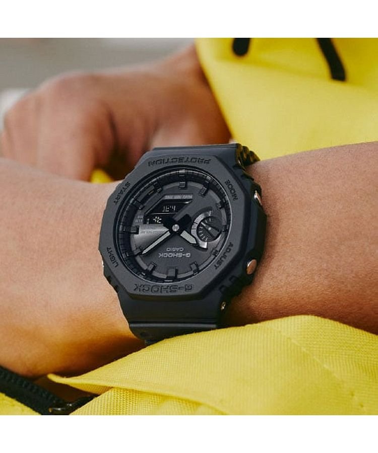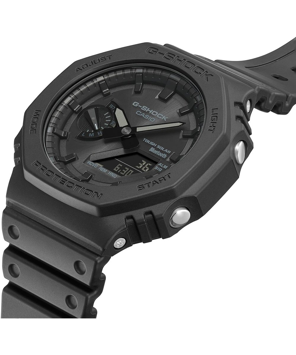 Casio G-SHOCK Carbon Core Guard Bluetooth Tought Solar GA-B2100-1A1ER to męski zegarek wykonany z wysokiej jakości, trwałych materiałów. Za prawidłową pracę odpowiedzialny jest mechanizm solarny. Urządzenie posiada wiele udogodnień, takich jak Bluetooth® Smart, Smartphone time, Super Illuminator, system wstrząsoodporny, Neobrite, czas światowy, stoper - 1/100 sek. - 24h, timer - 1/1 sek. - 24h, 5 alarmów dziennych, wyświetlanie dni tygodnia w różnych językach, sygnały przycisków on/off, funkcja "zgubiony telefon", kalendarz automatyczny czy format 12-/24-godzinny. Wodoszczelność oszacowano na poziomie 200 metrów.
