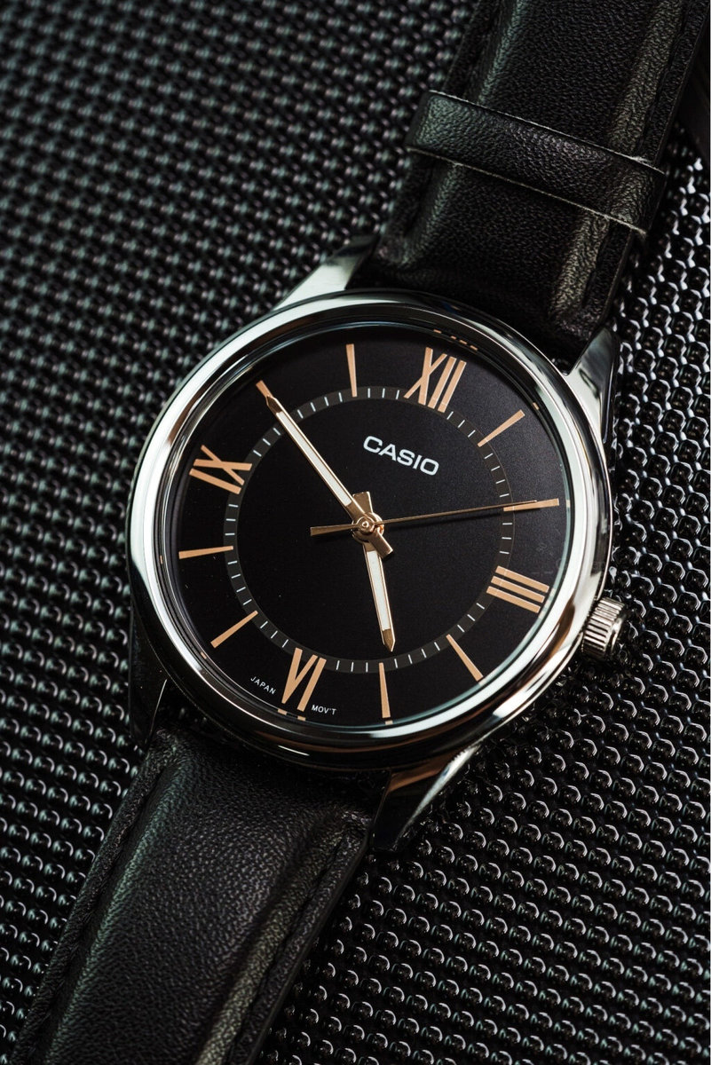 Zegarek Casio MTP-V005L-1B5 to klasyczny męski zegarek. Czarny skórzany pasek oraz stalowa koperta oraz w kolorze srebrnym zapewnia niezawodność oraz komfort użytkowania. Na czarnej tarczy wskazują różowo-złote indeksy. Dzięki połączeniu prostoty, elegancji i niezawodności, zegarek Casio MTP-V005L-1B5 staje się nie tylko praktycznym dodatkiem do codziennego stroju, ale także wyrazem osobistego stylu i klasy. Niezależnie od okazji, ten zegarek będzie doskonałym towarzyszem, podkreślającym Twój indywidualny styl i pewność siebie