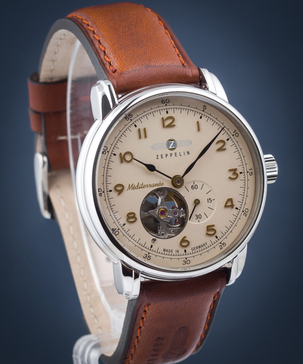 Zeppelin Mediterranee Open Heart Automatic 9666-5 to męski zegarek w klasycznym designie. Okrągła koperta jest połączona z brązowym paskiem uszytym ze skóry naturalnej. Beżowy cyferblat zawiera subtarczę z sekundnikiem oraz okienko open-heart, które umożliwia obserwację pracy japońskiego mechanizmu automatycznego Miyota 82S5. Co więcej, tarcza jest zabezpieczona utwardzanym szkiełkiem mineralnym K1.
