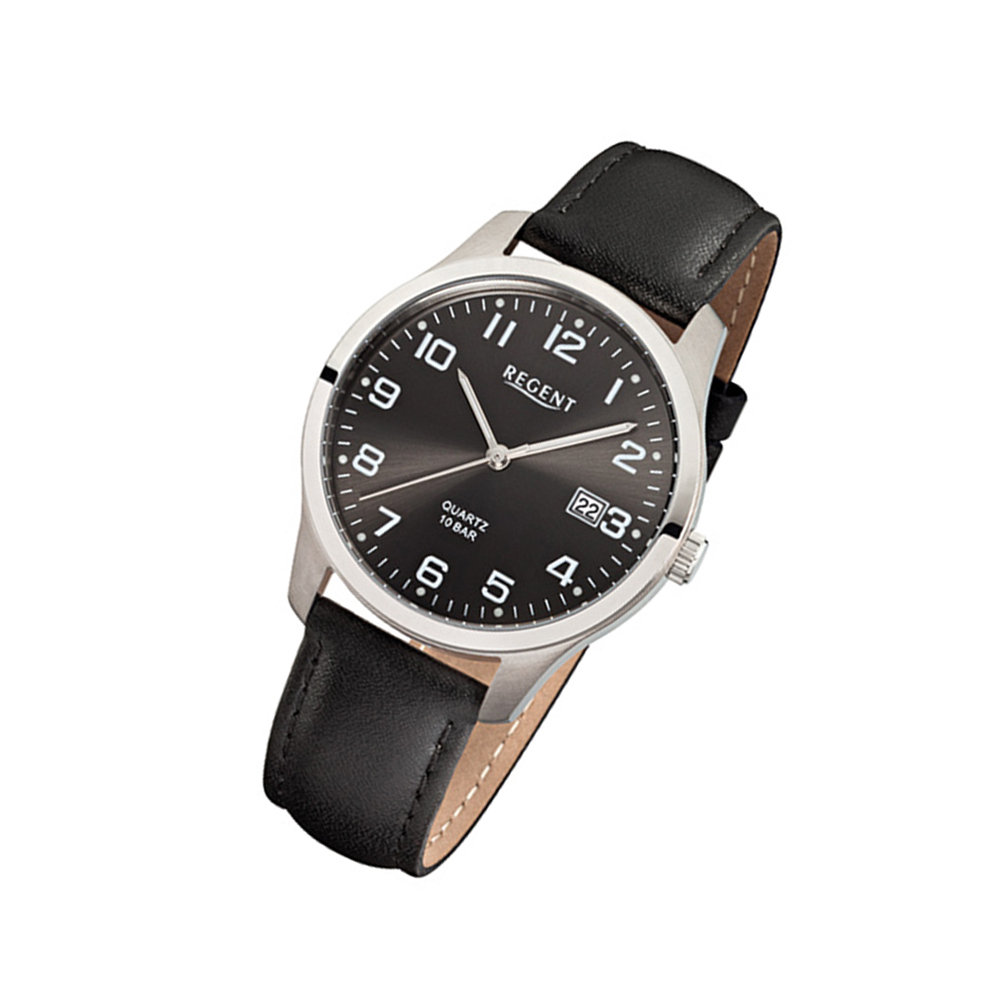 Opis produktu: Elegancki zegarek marki Regent posiada skórzany pasek w kolorze czarnym zapinany na sprzączkę. Męski zegarek z kolekcji zegarków Regent Titan jest analogowy z mechanizmem kwarcowym i ...