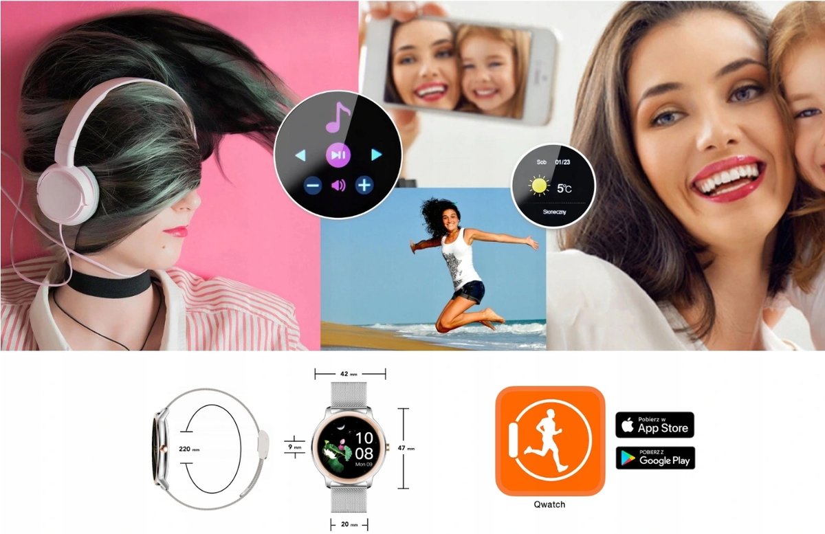 Po połączeniu zegarka z telefonem za pomocą aplikacji "Qwatch" uzyskujemy dostęp do takich funkcji jak: Powiadomienia o przychodzących połączeniach i wiadomościach, przypomnienie alarmu, pomiar tętna, przypomnienie o piciu wody, możliwość zmiany wyglądu tarczy zegarka, tryb krokomierza oraz pomiaru ciśnienia krwi.
