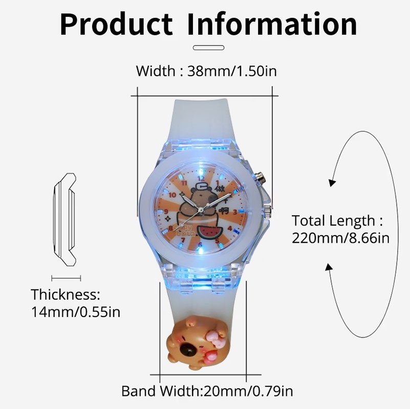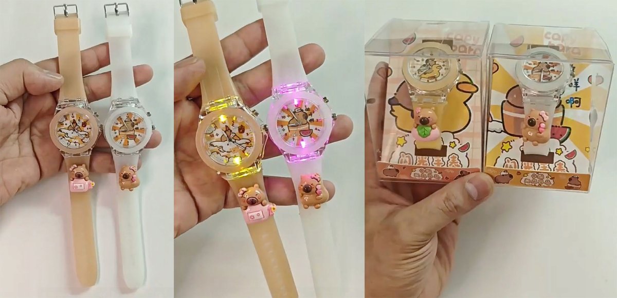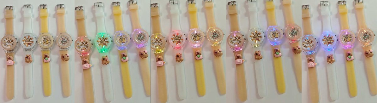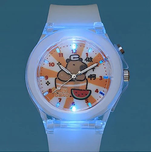 Na innych aukcjach proponujemy inne kolory i wzory zagarków z KAPIBARĄ. Na ostatnich zdjęciach pokazujemy jak zegarki zmieniają kolor światła