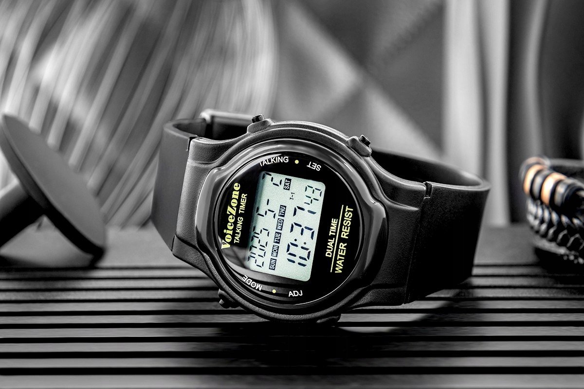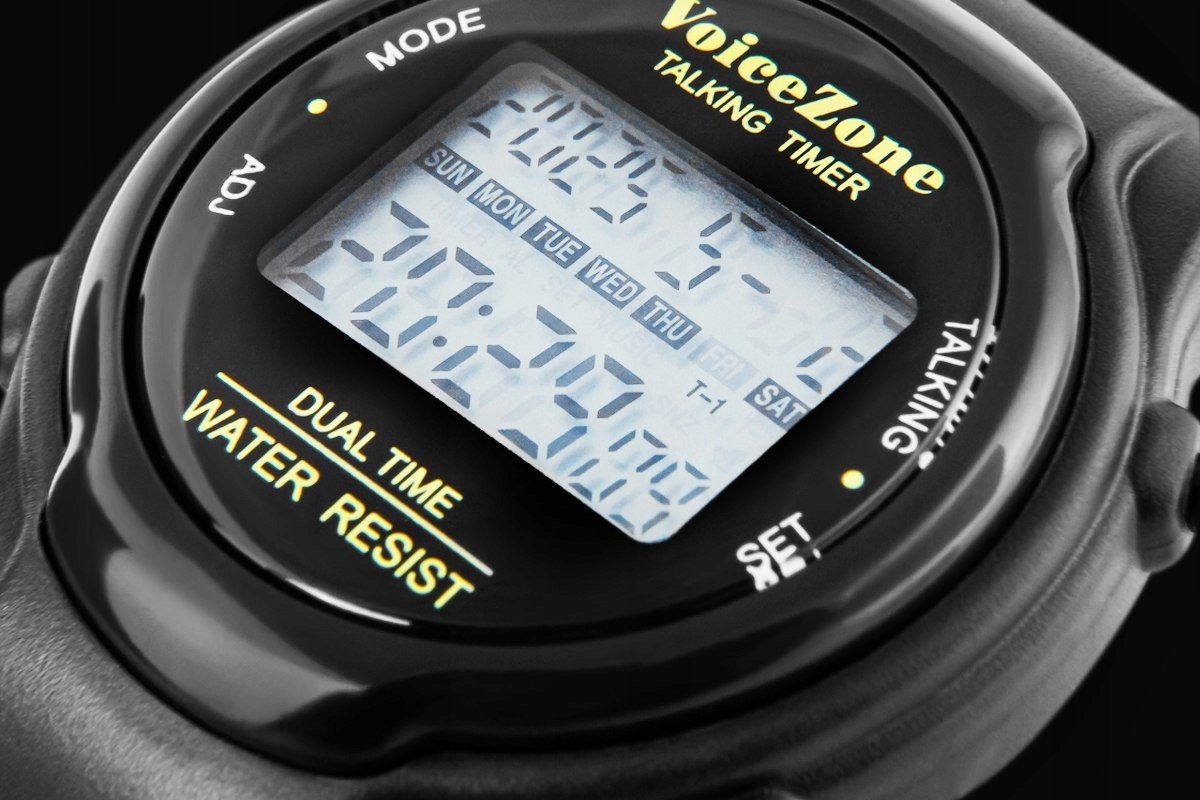 Zegarek informuje głosowo o aktualnym czasie w dwóch strefach czasowych - świetna opcja np. przy kontakcie z rodziną za granicą. Ma również mówiący budzik z funkcją drzemki (dobudzania) oraz głosowy timer - przydatny w kuchni, podczas ćwiczeń lub na spacerze.