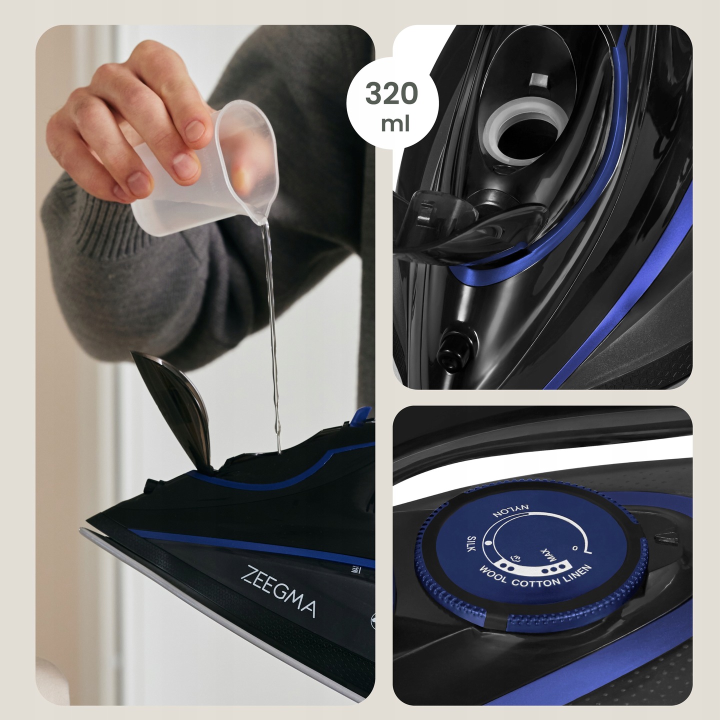 Duża pojemność zbiornika 320 ml pozwala prasować dłużej bez uzupełnienia wody. Jego przezroczysta powłoka umożliwia stałe kontrolowanie poziomu wody, dzięki czemu zawsze będziesz wiedzieć, kiedy należy ją dolać. Optymalny rozmiar zbiornika gwarantuje równomierną i skuteczną dystrybucję pary, nawet podczas intensywnego prasowania. Eisig Base doskonale sprawdzi się podczas prasowania dużej liczby ubrań, zasłon i pościeli.