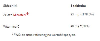 Składnik - 1 kapsułka (%RWS) Żelazo Microferr® - 25mg (178.5 %)Witamina C - 40mg (50%) Żelazo w postaci Microferr® (fumaran żelaza (II), Pirofosforan żelaza (III)), ...